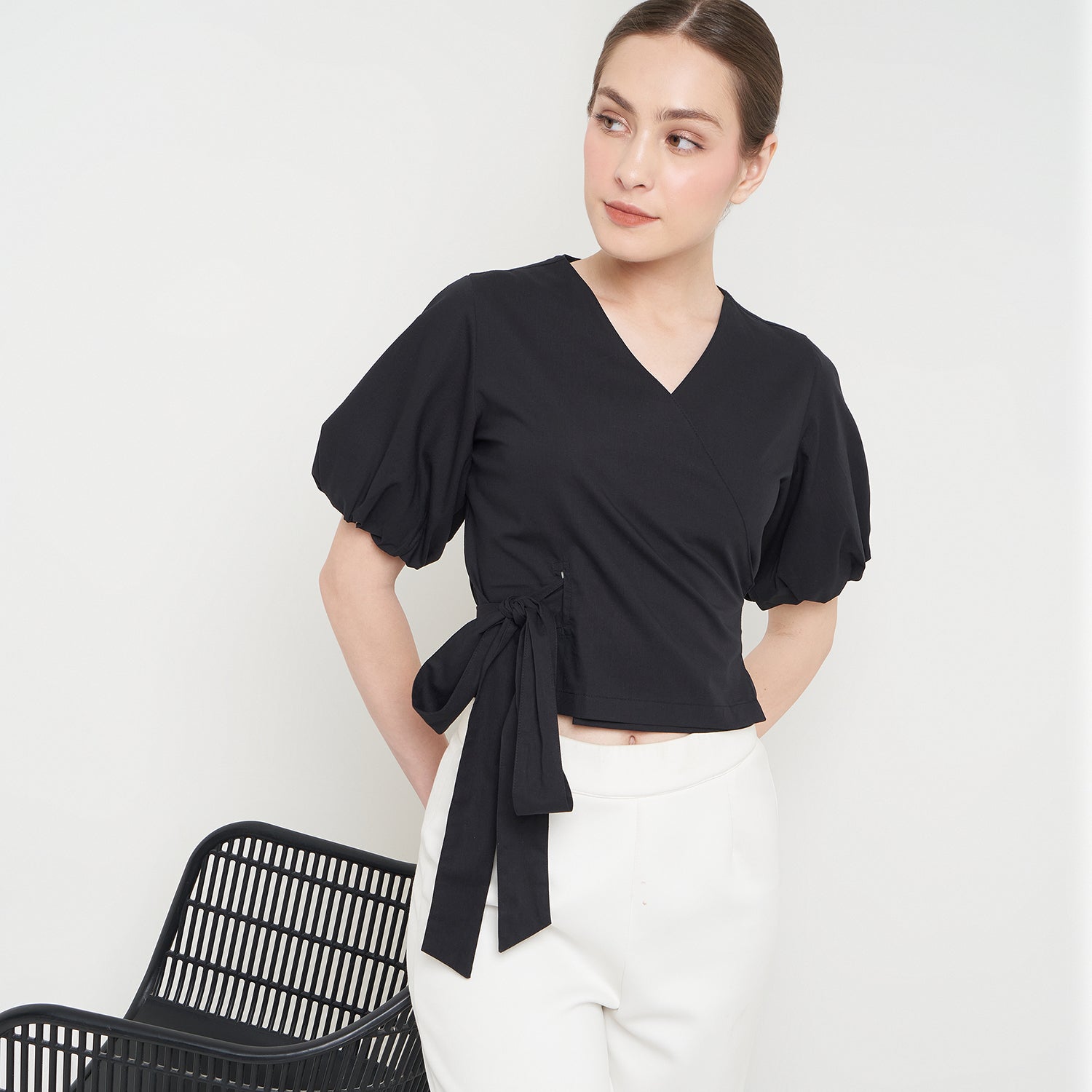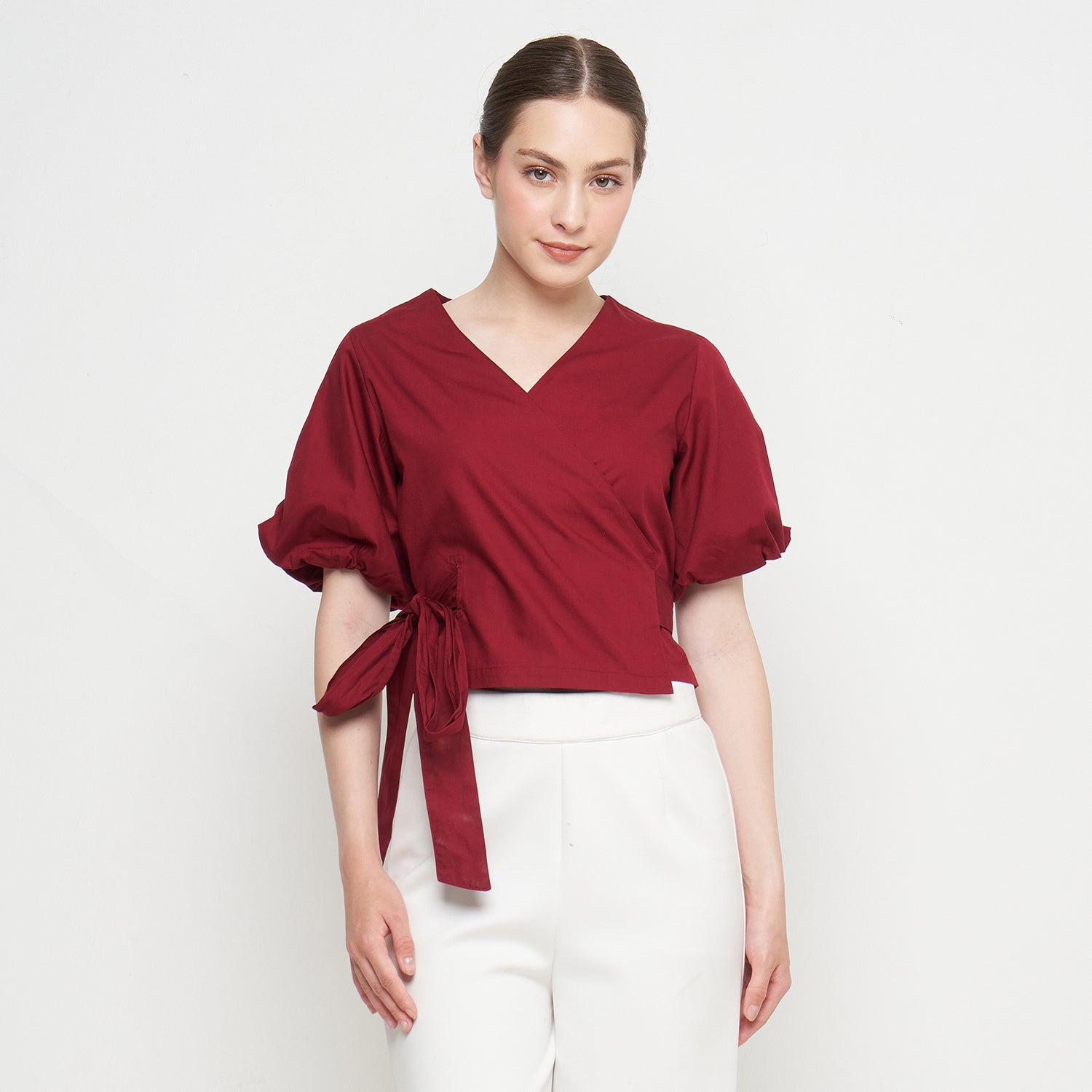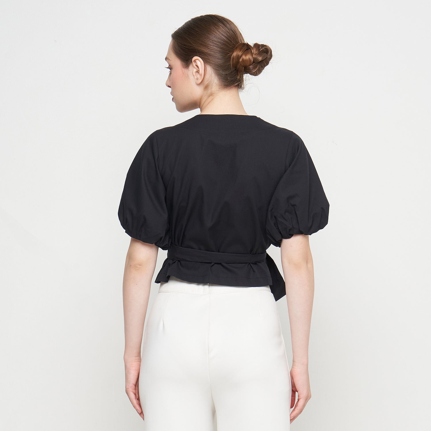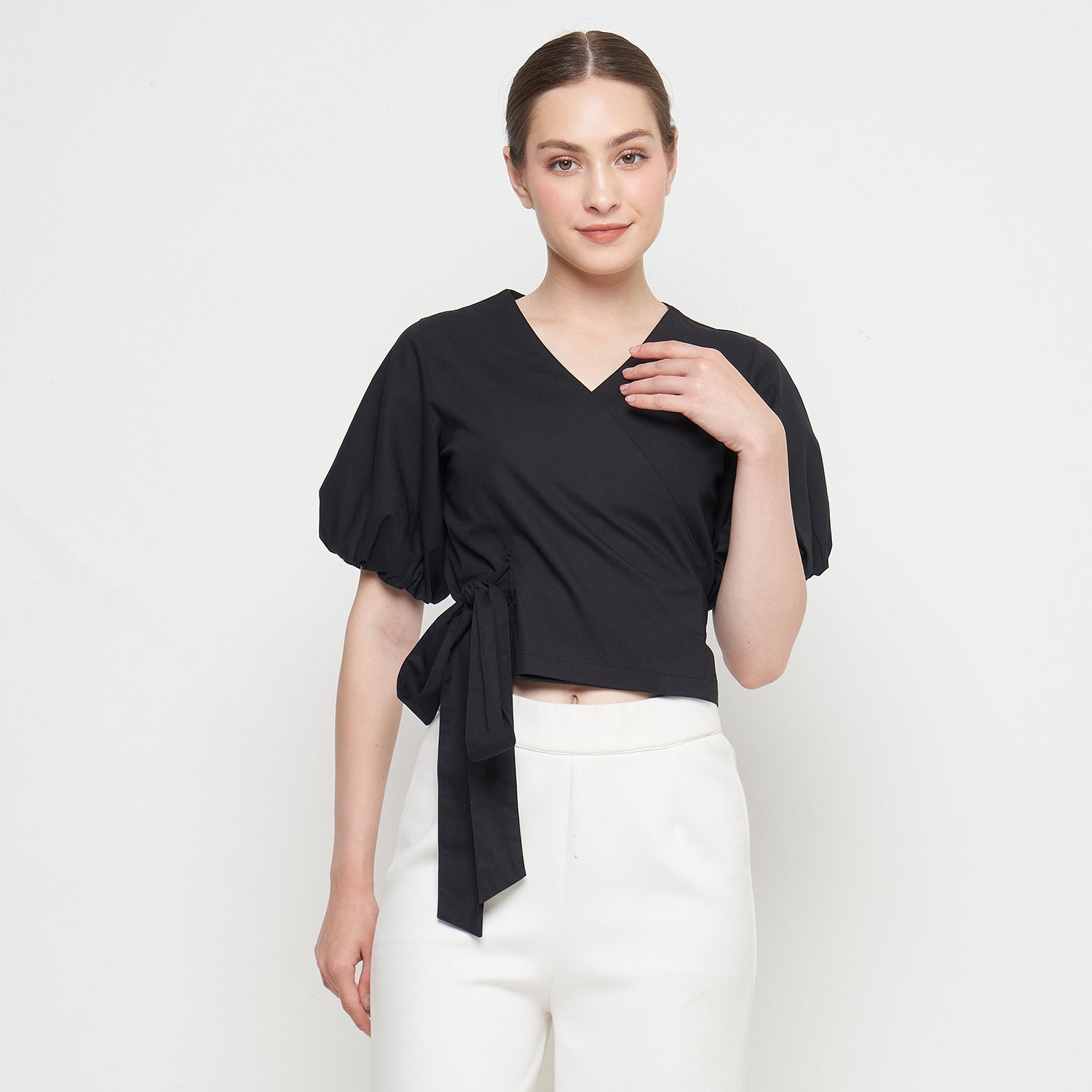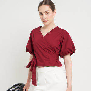 Features: Crop Top, Short Balloon Sleeves, Wrapped, Adjustable Tie
