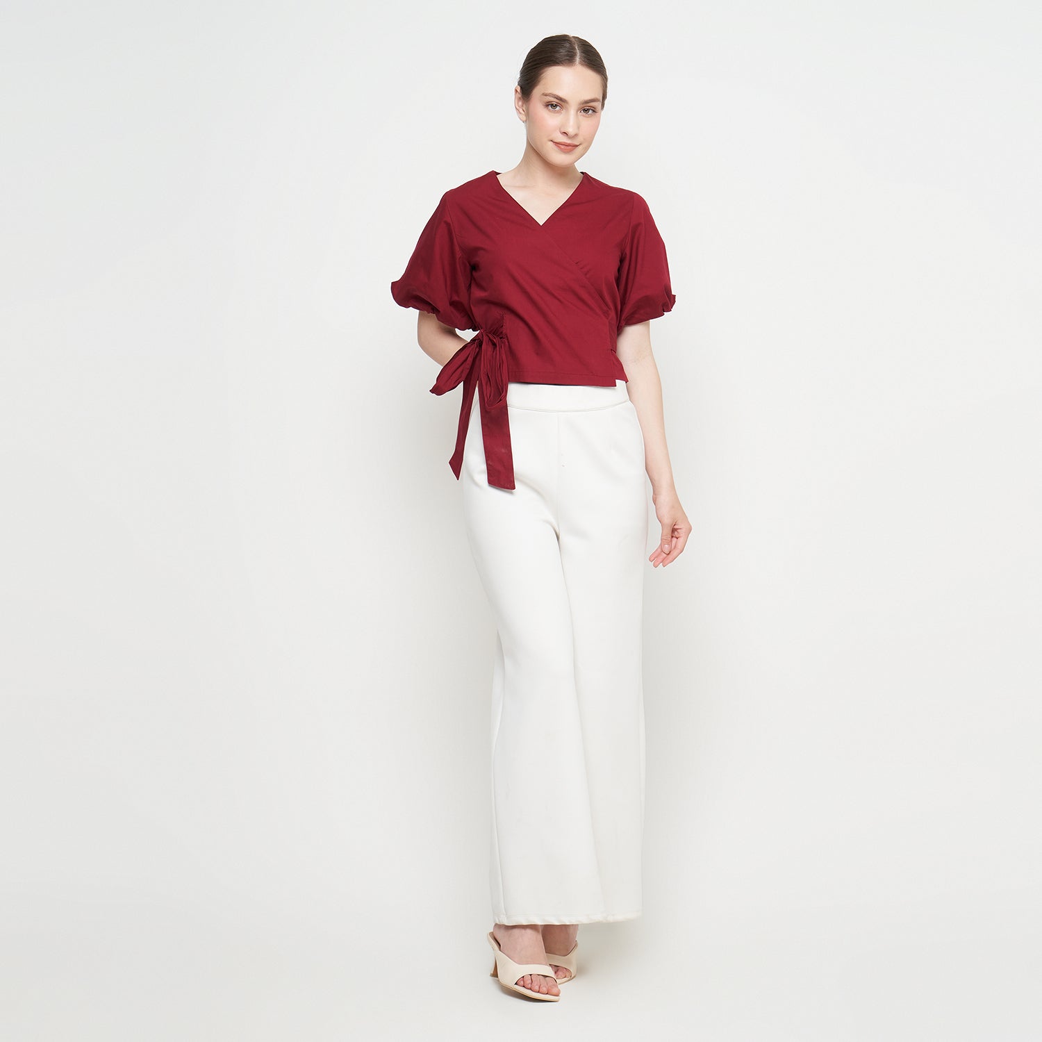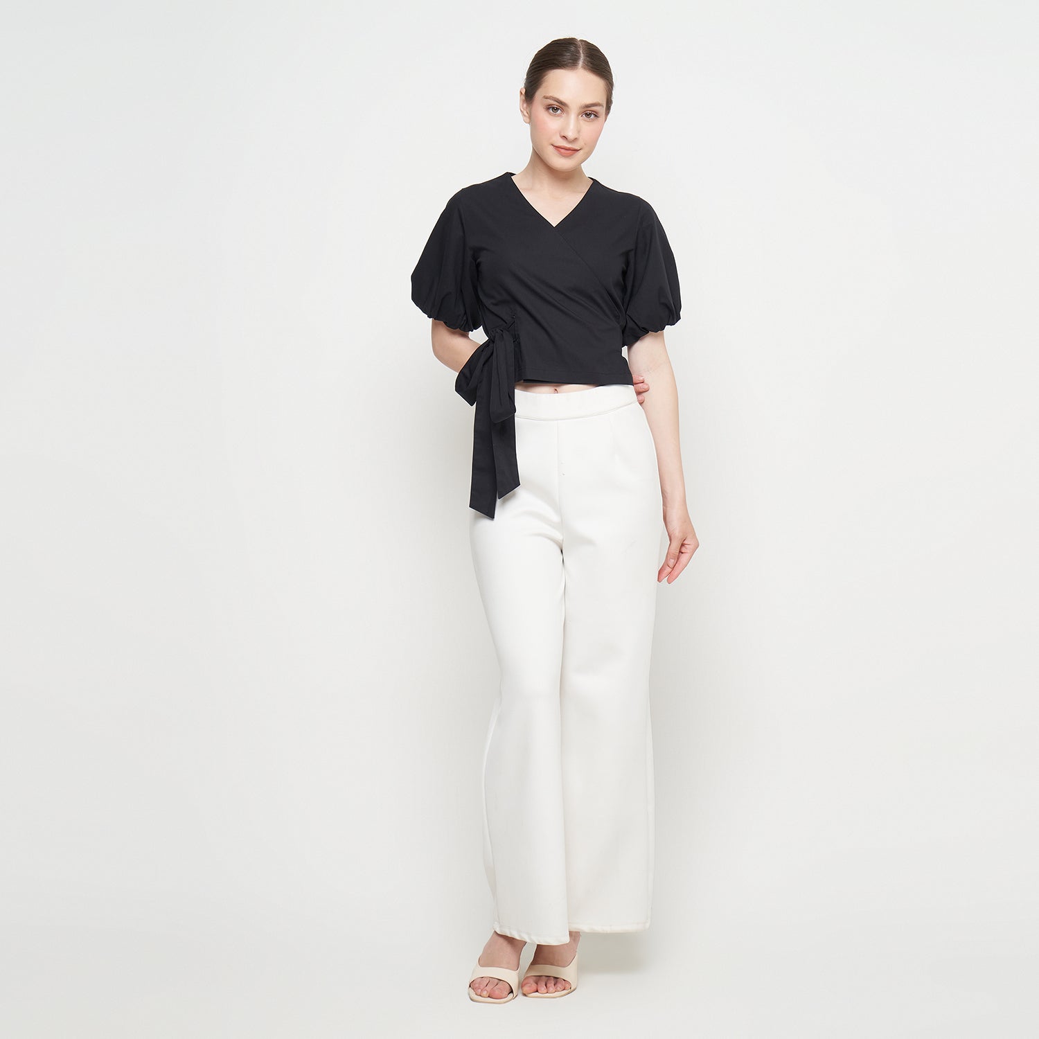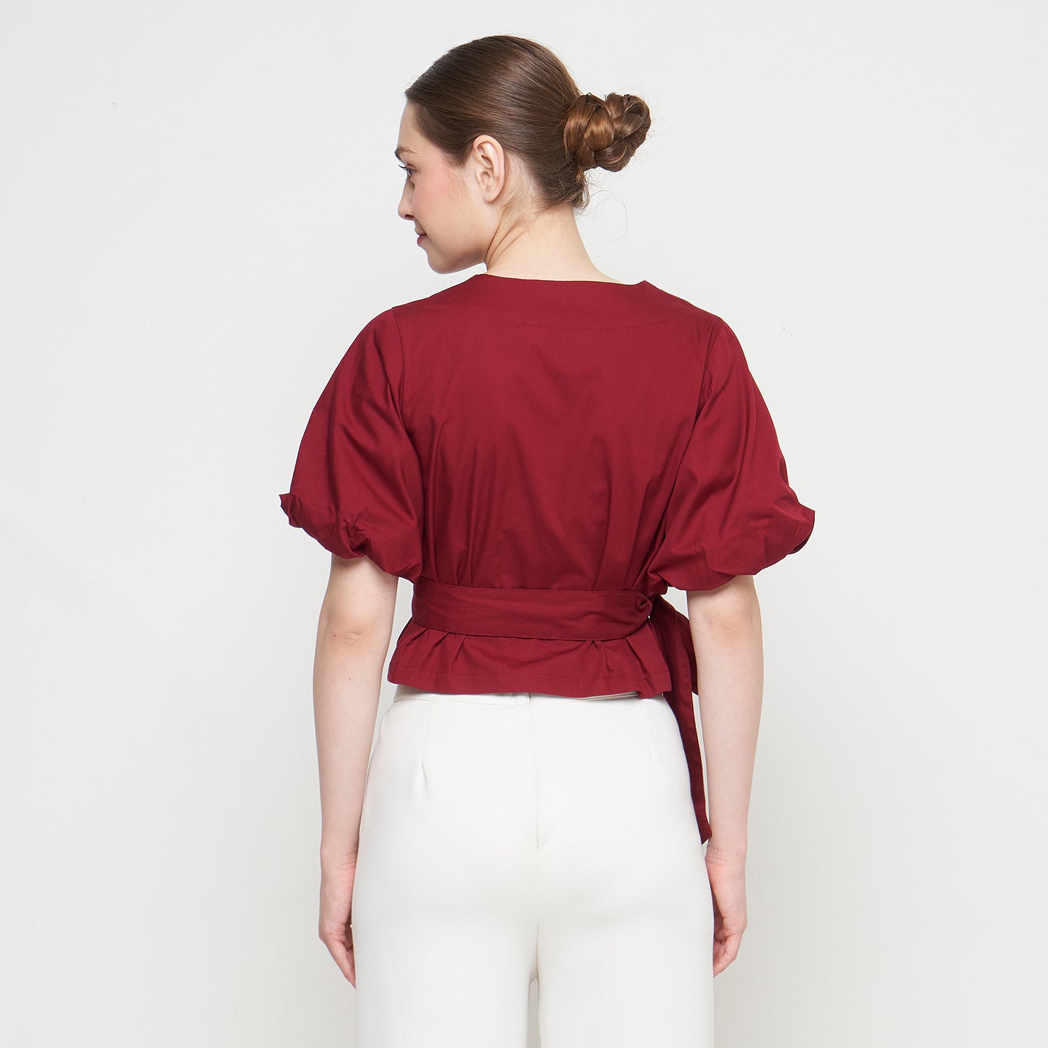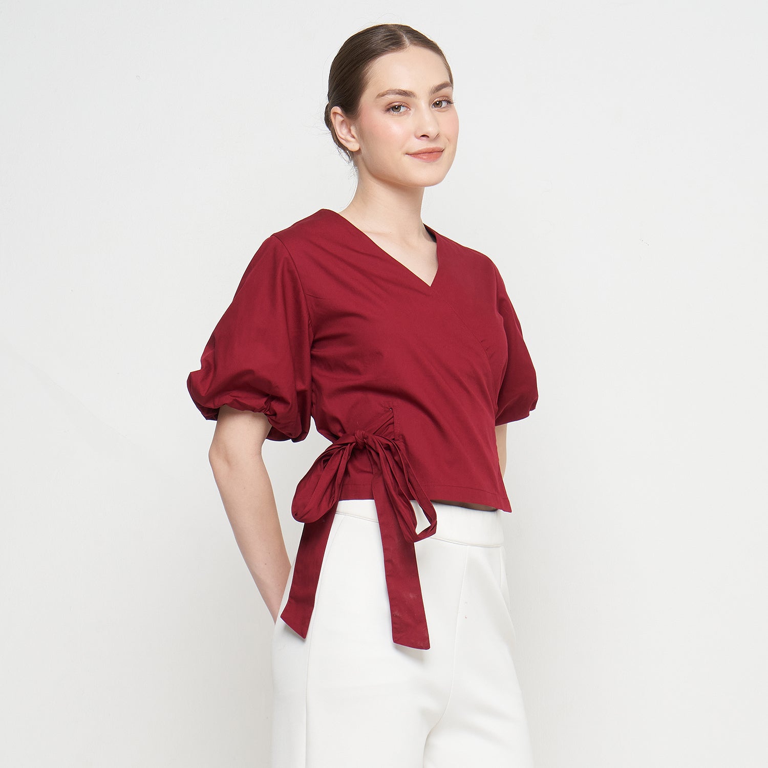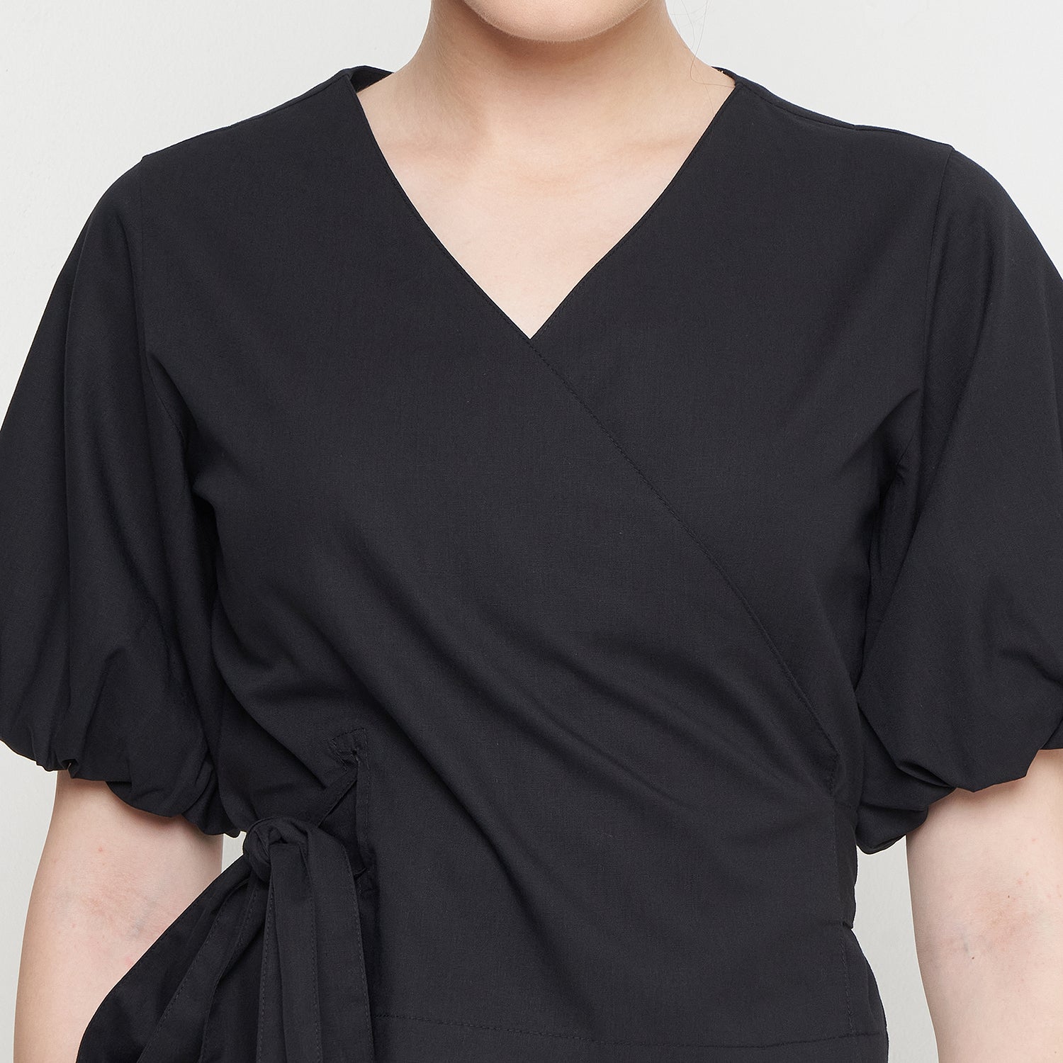 Features: Crop Top, Short Balloon Sleeves, Wrapped, Adjustable Tie