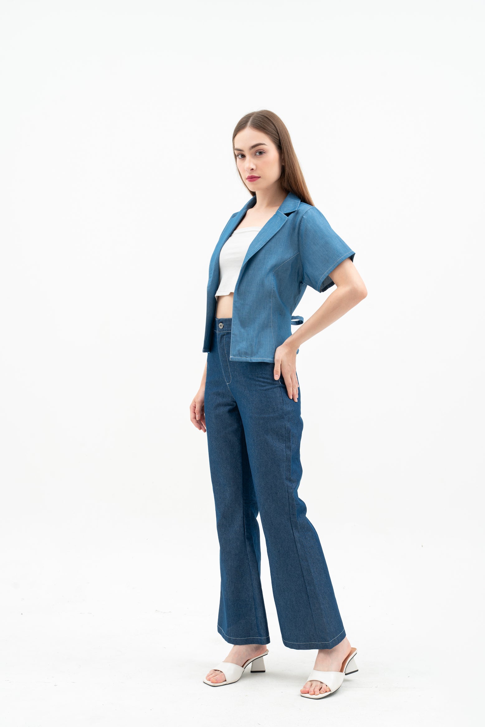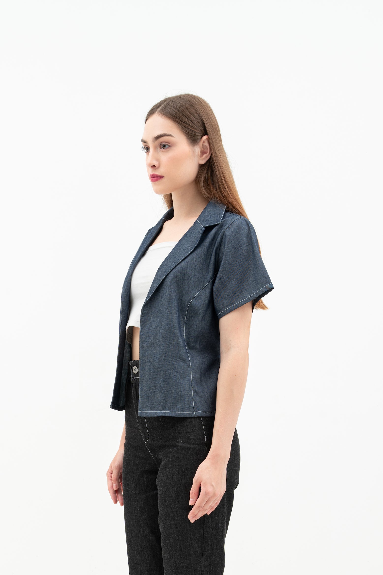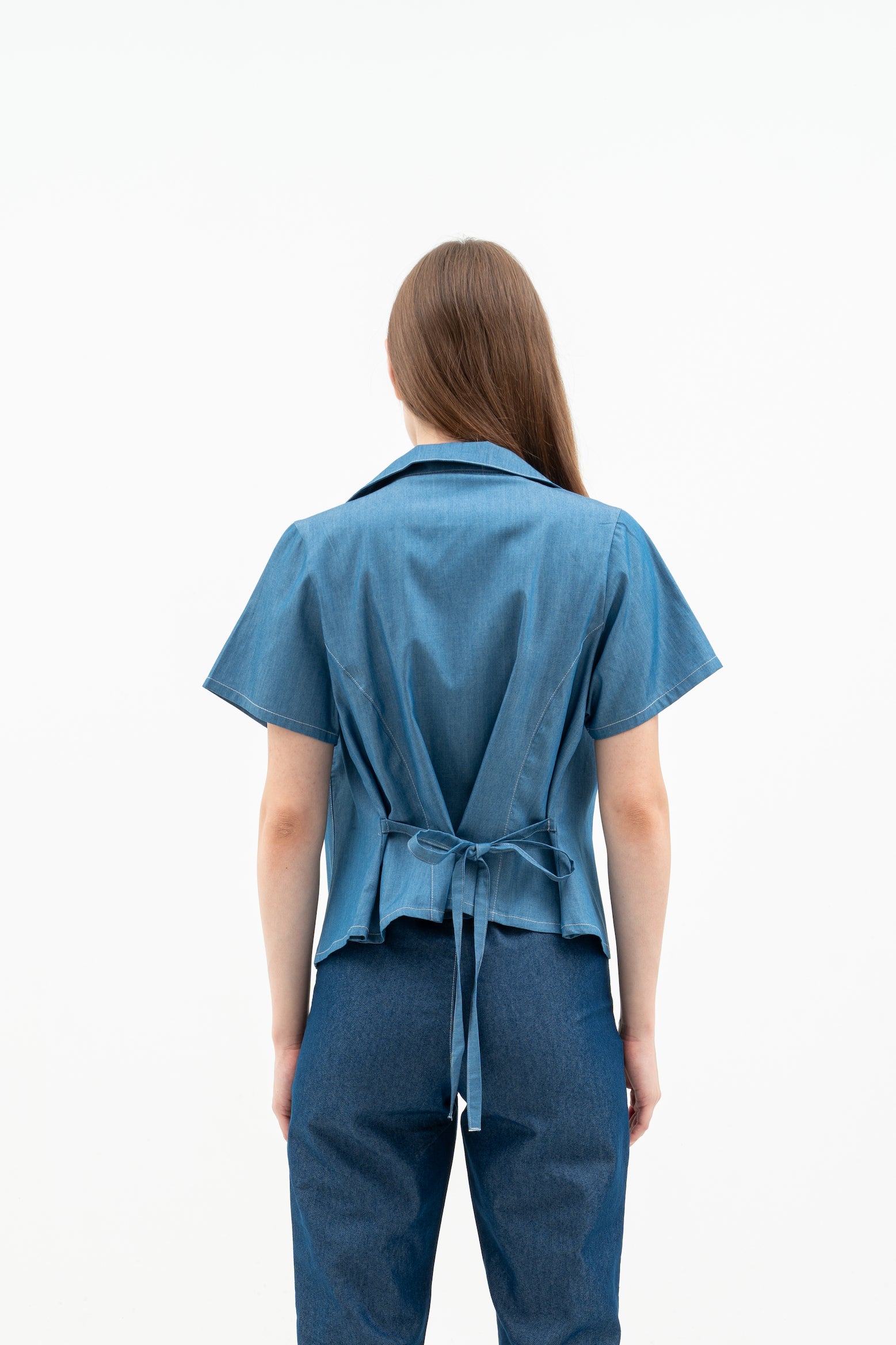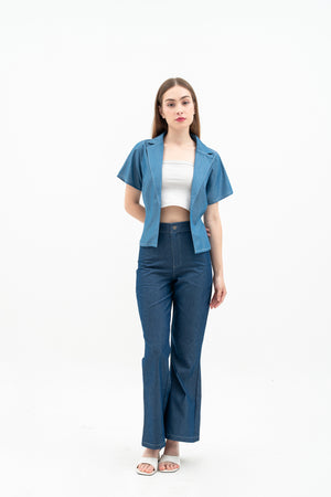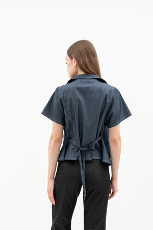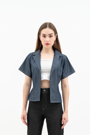 Cherra Women's Denim Outer is a short-sleeve, regular-fit denim jacket with a sleek, open-front design. It features a flattering princess line and a small tie at the back for a stylish, feminine touch.