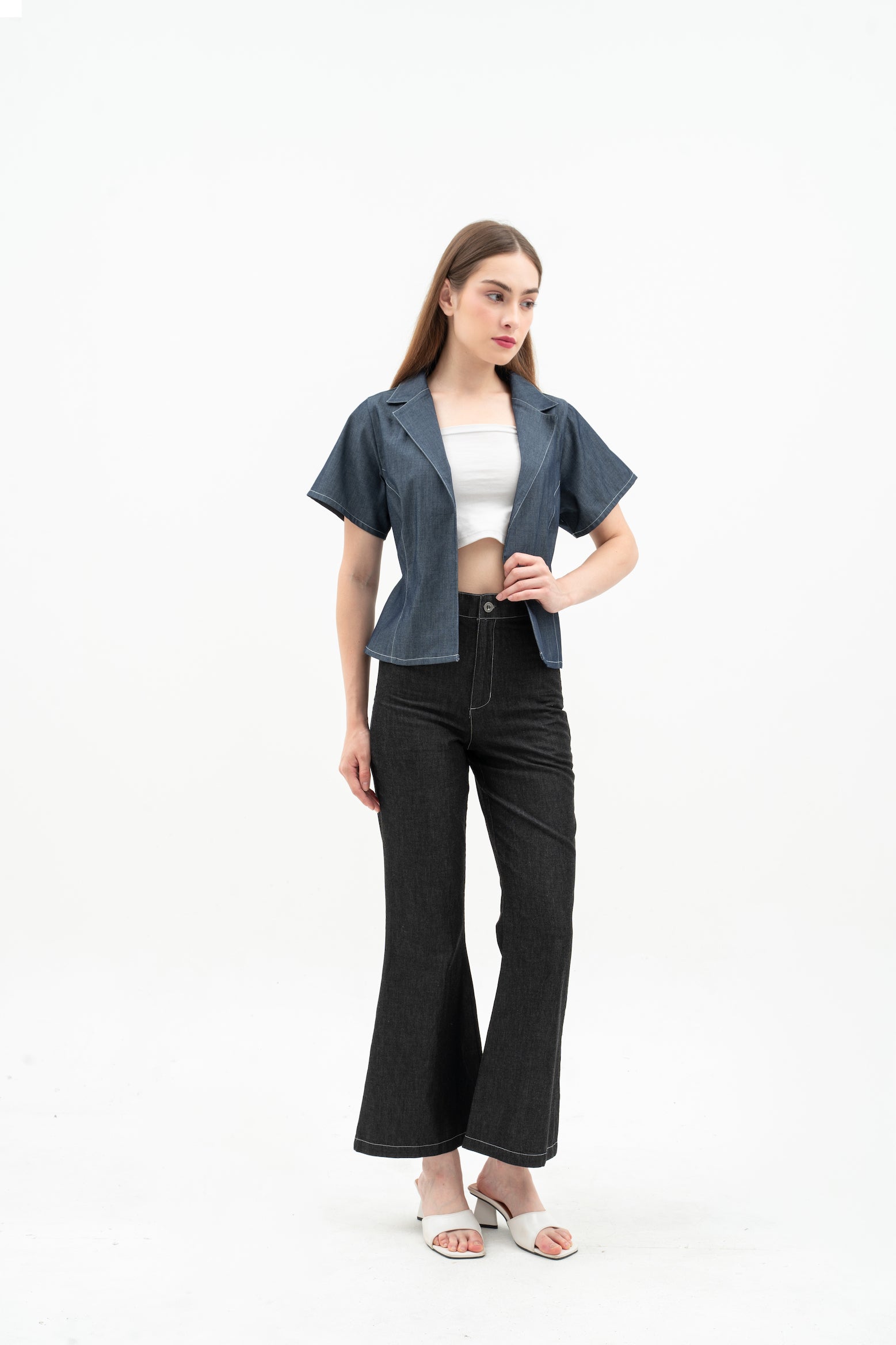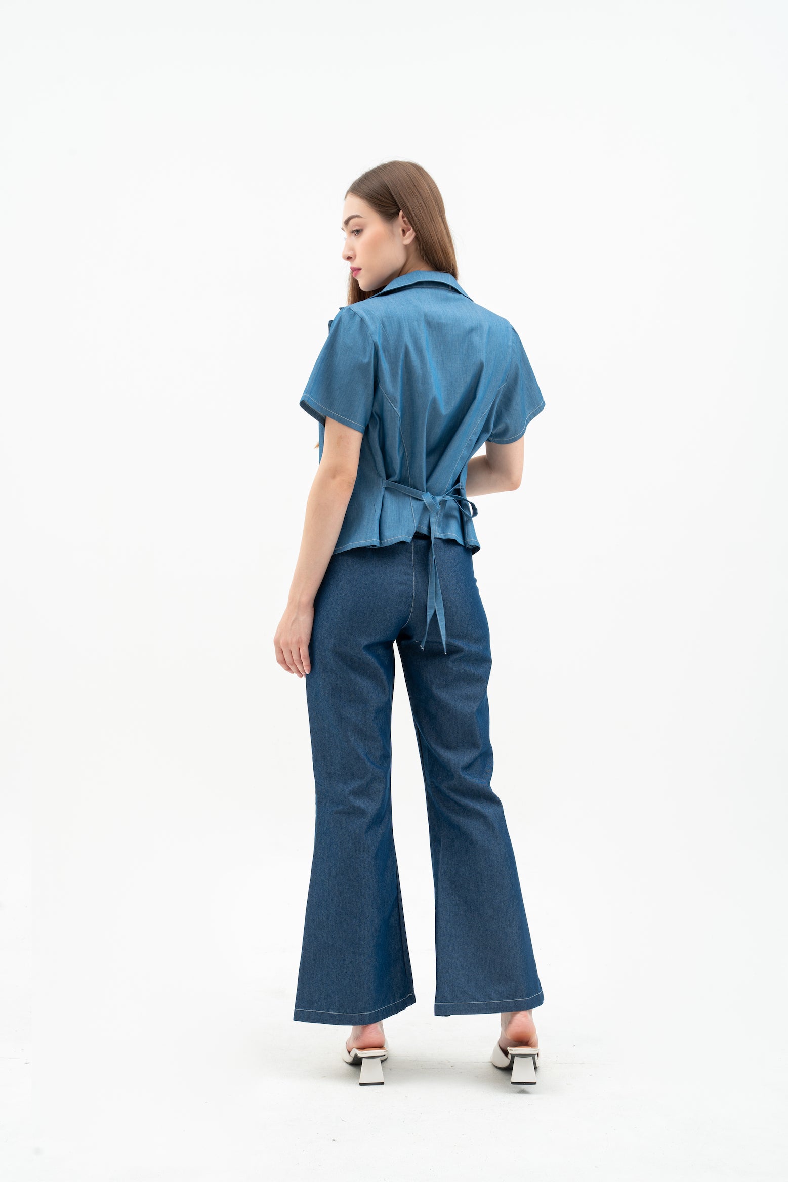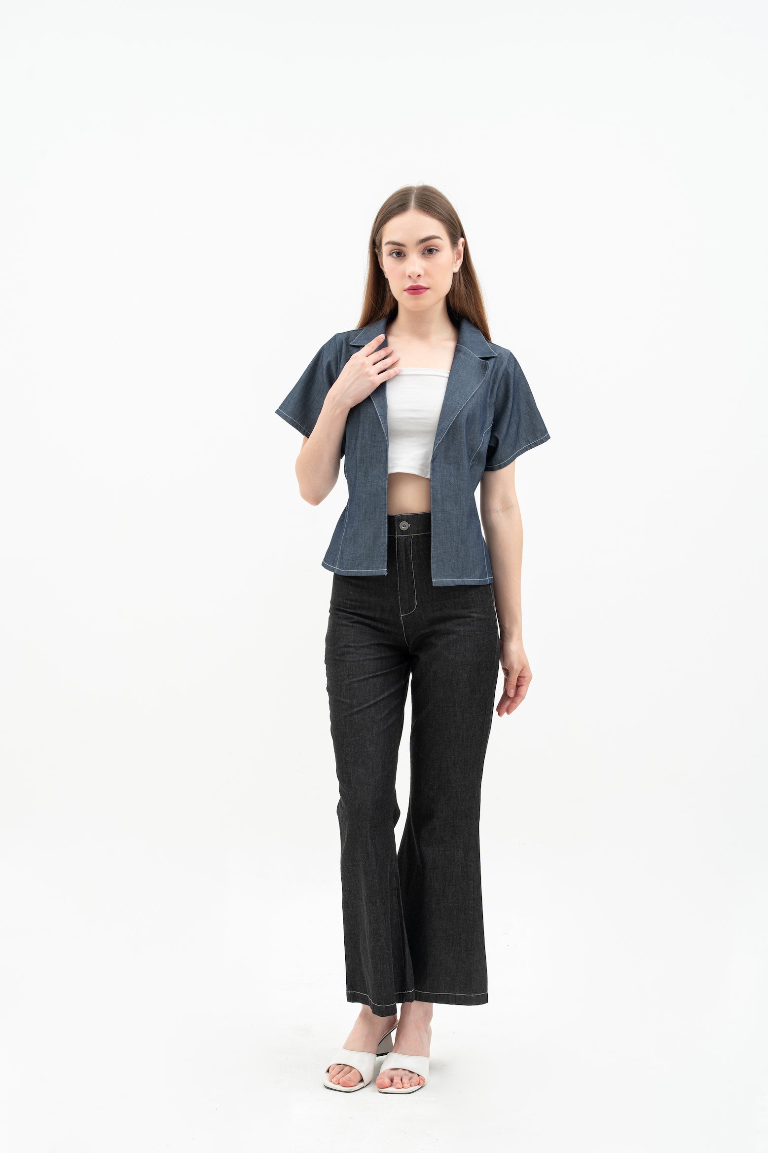Cherra Women's Denim Outer is a short-sleeve, regular-fit denim jacket with a sleek, open-front design. It features a flattering princess line and a small tie at the back for a stylish, feminine touch.