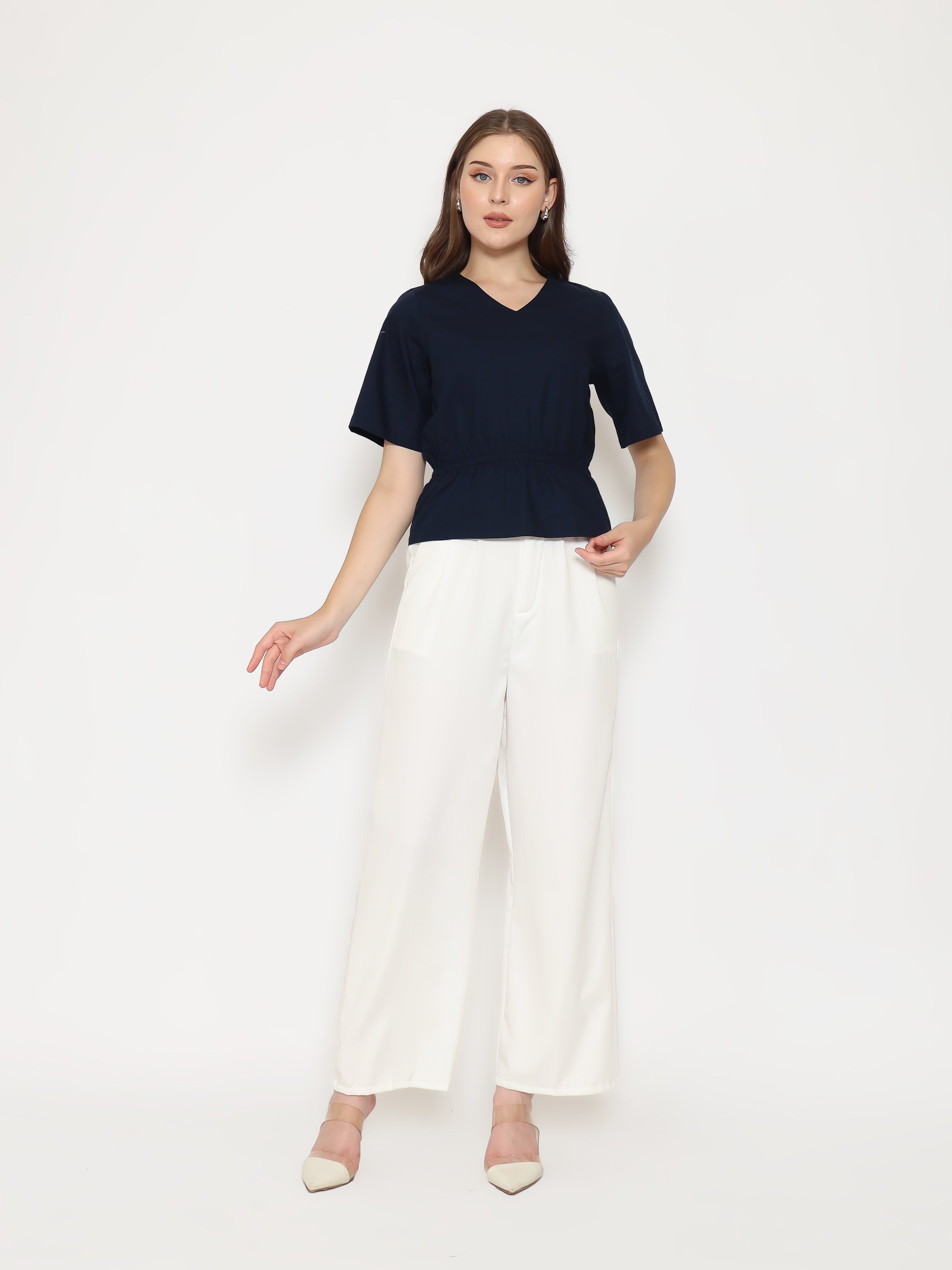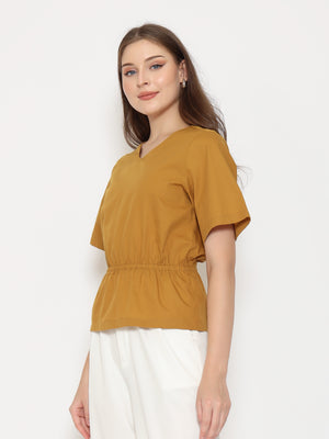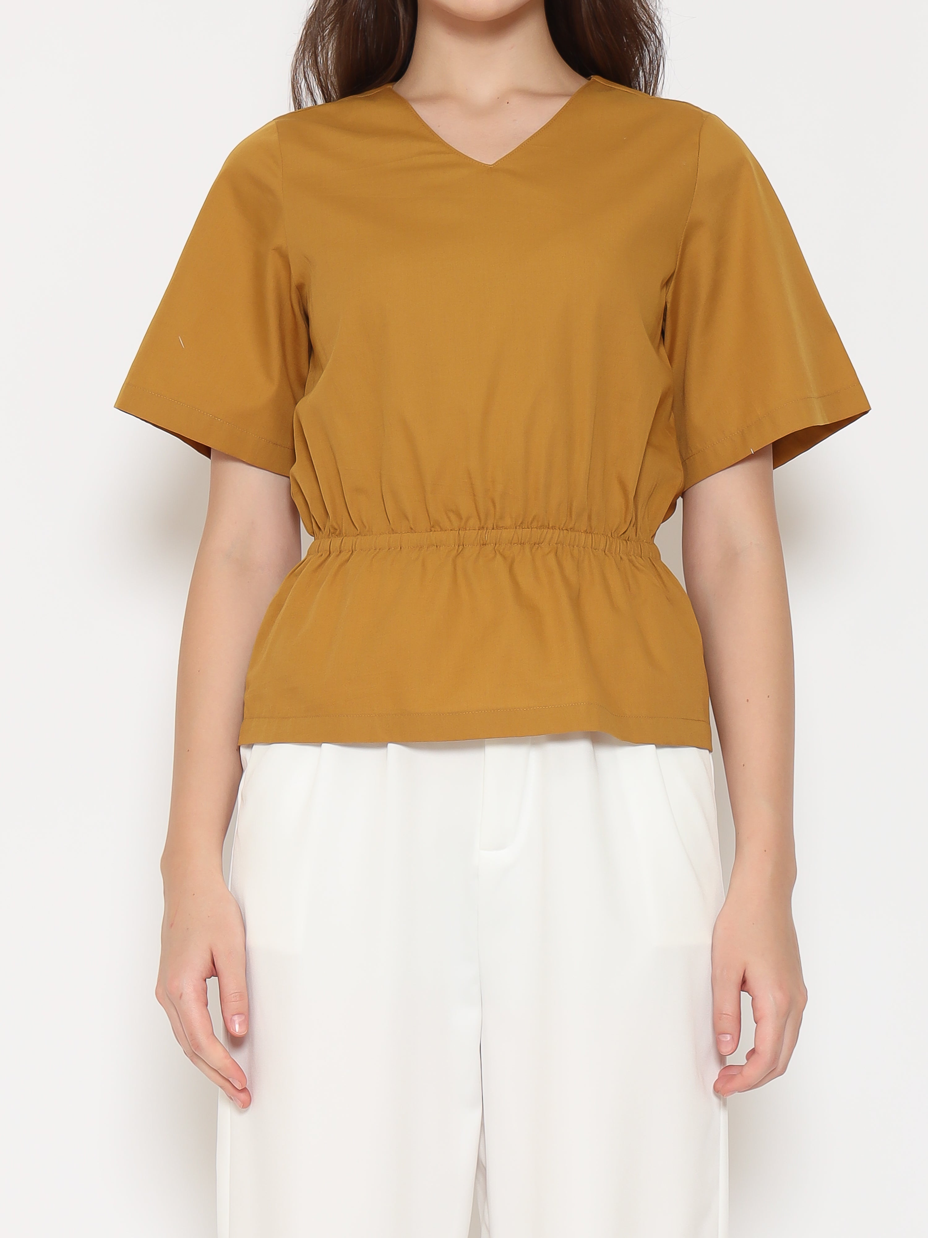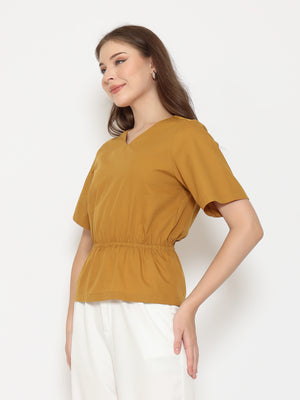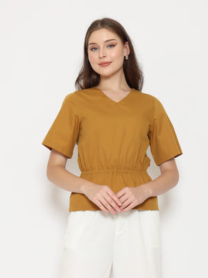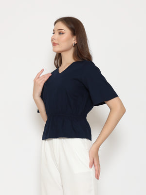 Features: Regular-Fit Top, V-Neckline, Gathered Waist-Band, Invisible Zipper, Short Sleeves