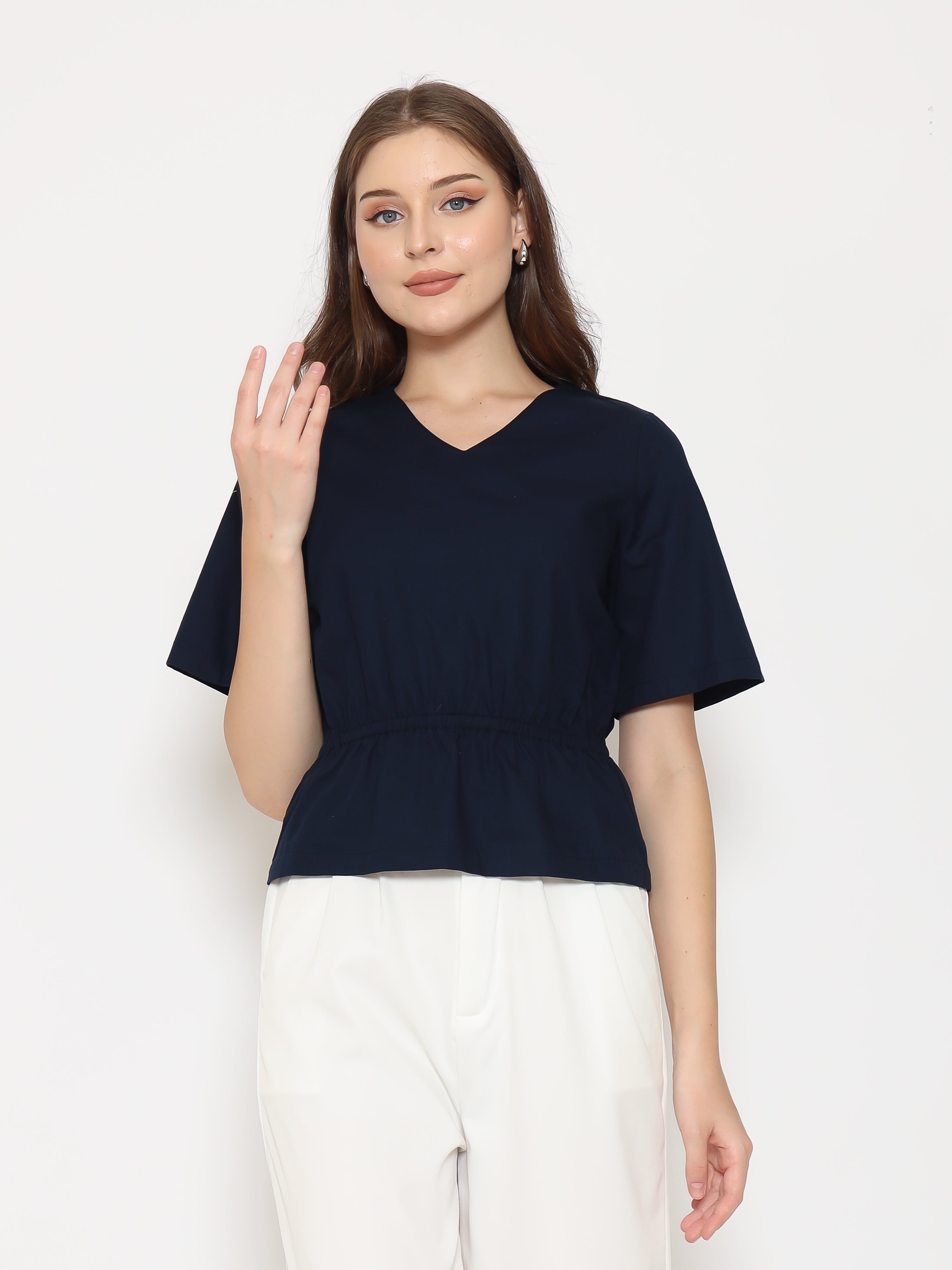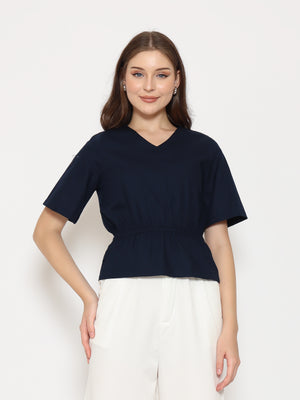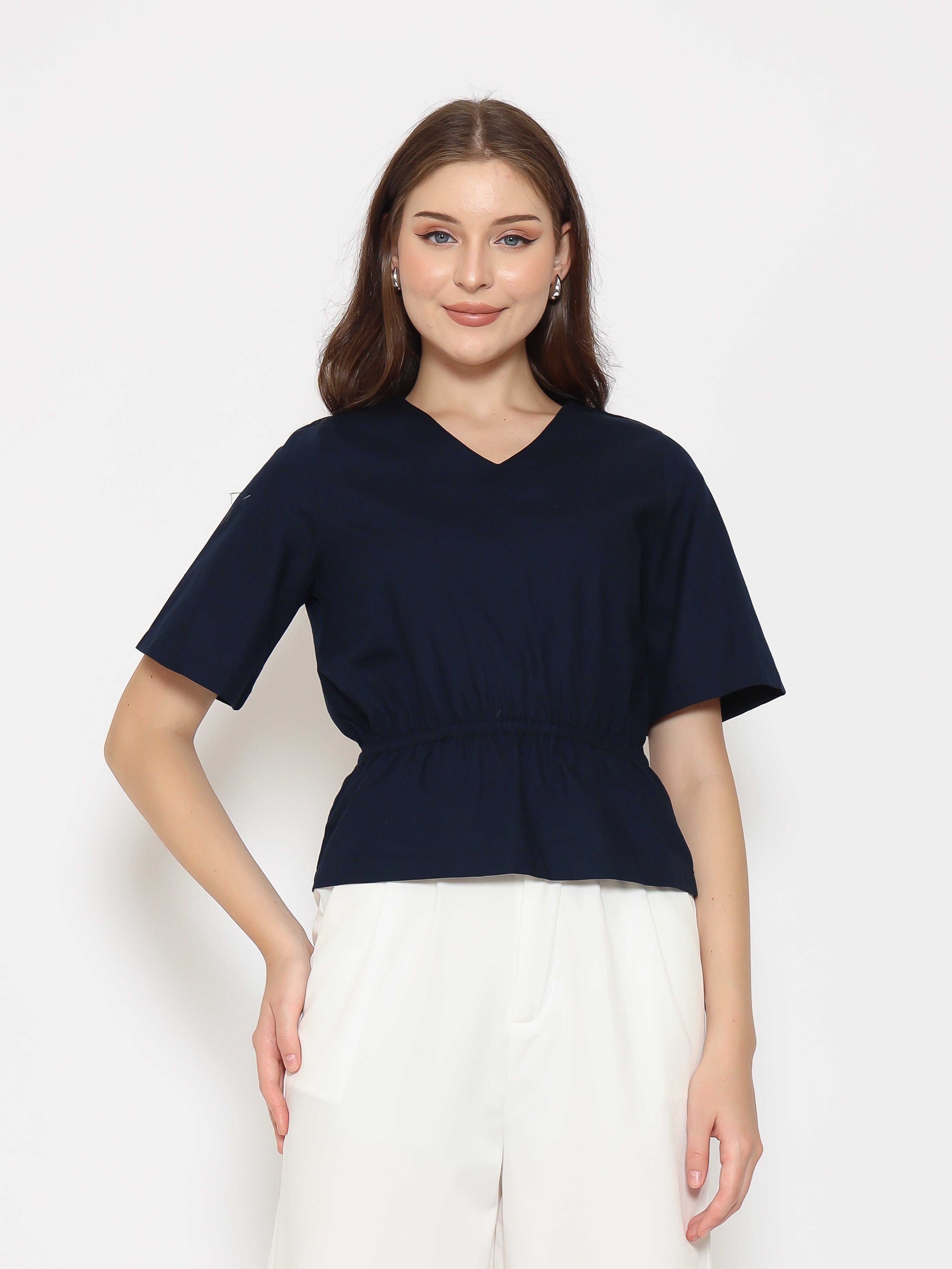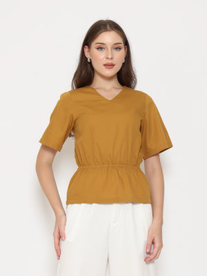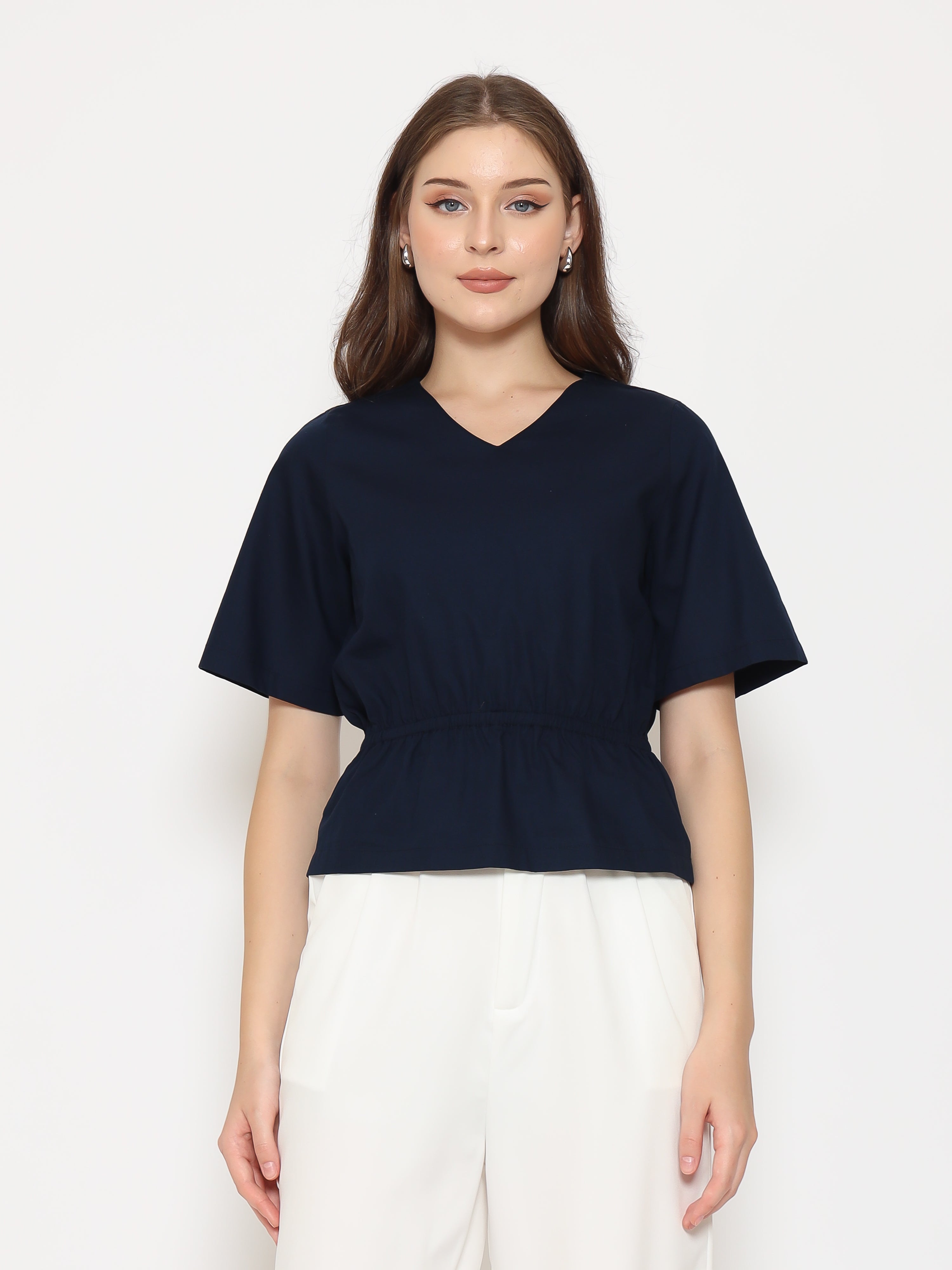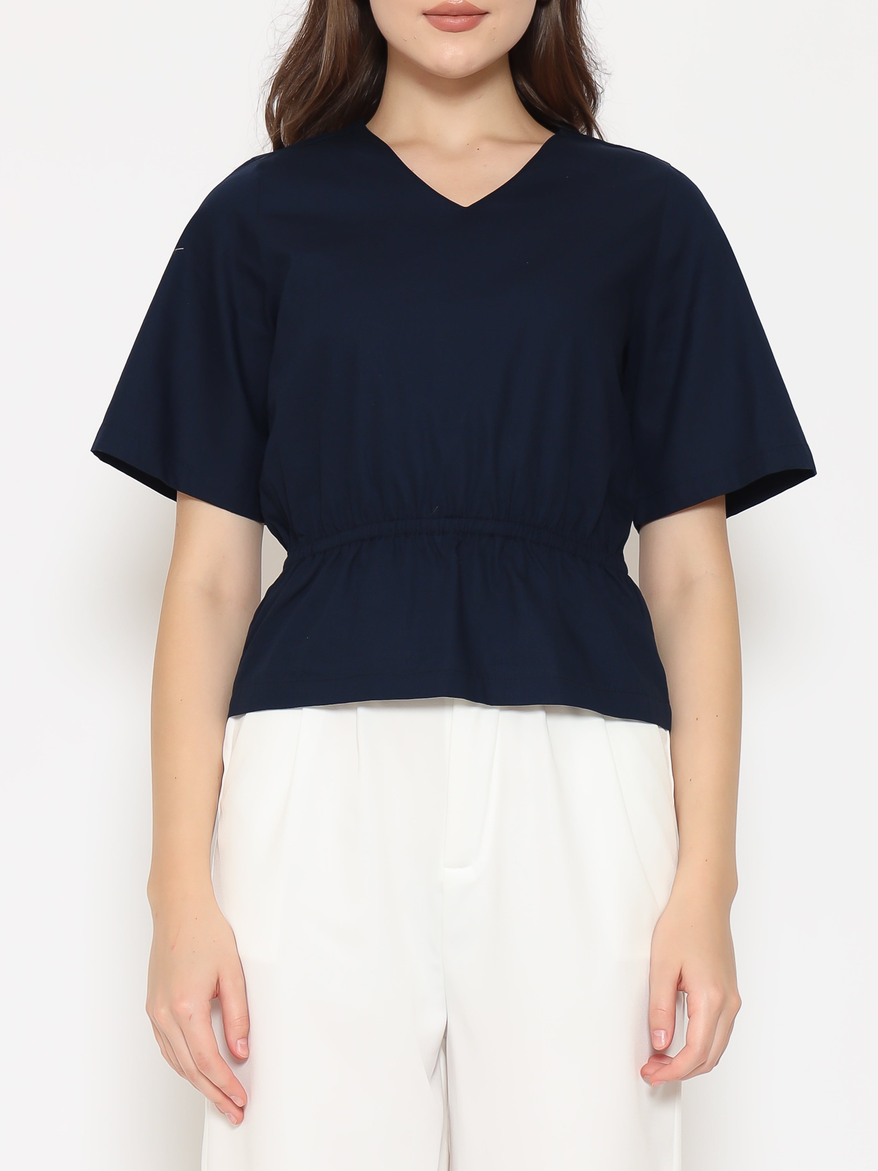 A flattering everyday top with refined details. The Harlow Womens Gathered Top features a V-neckline and gathered waistband that creates a soft, feminine silhouette. Made from crisp cotton poplin for a clean and comfortable fit.