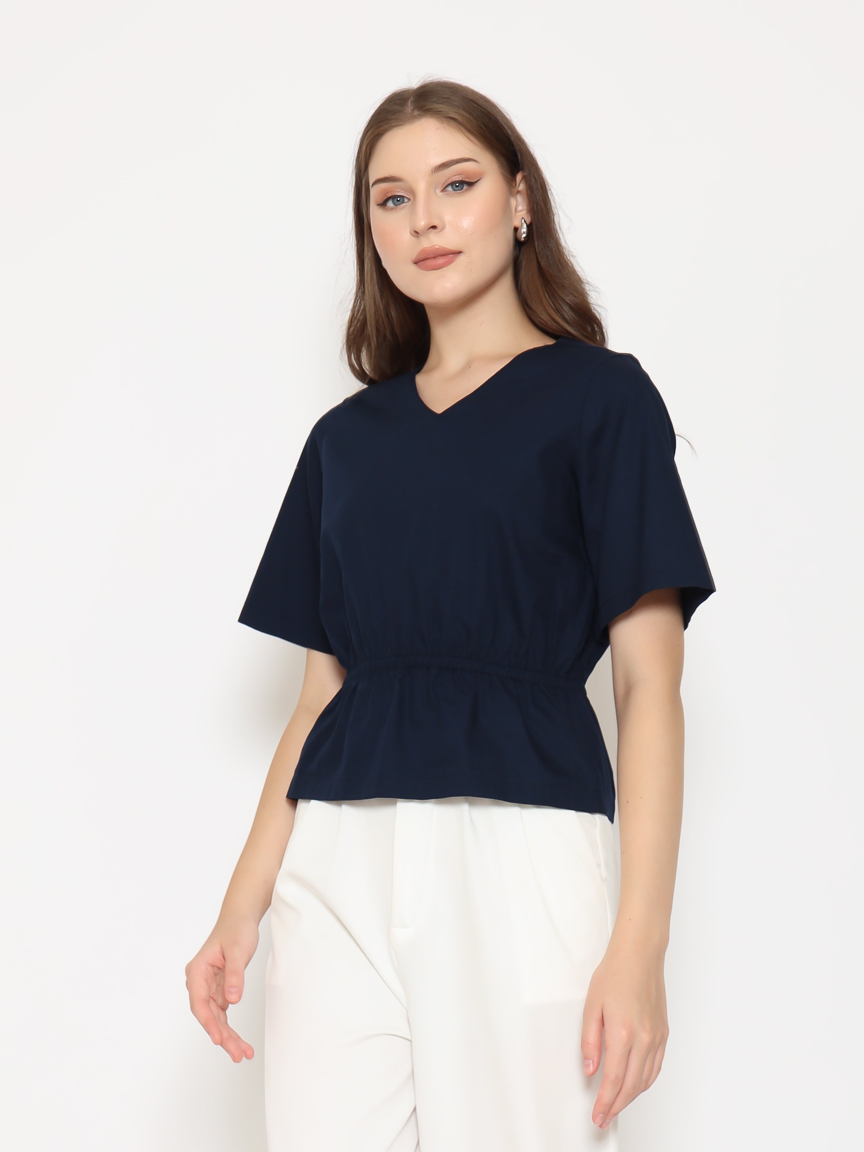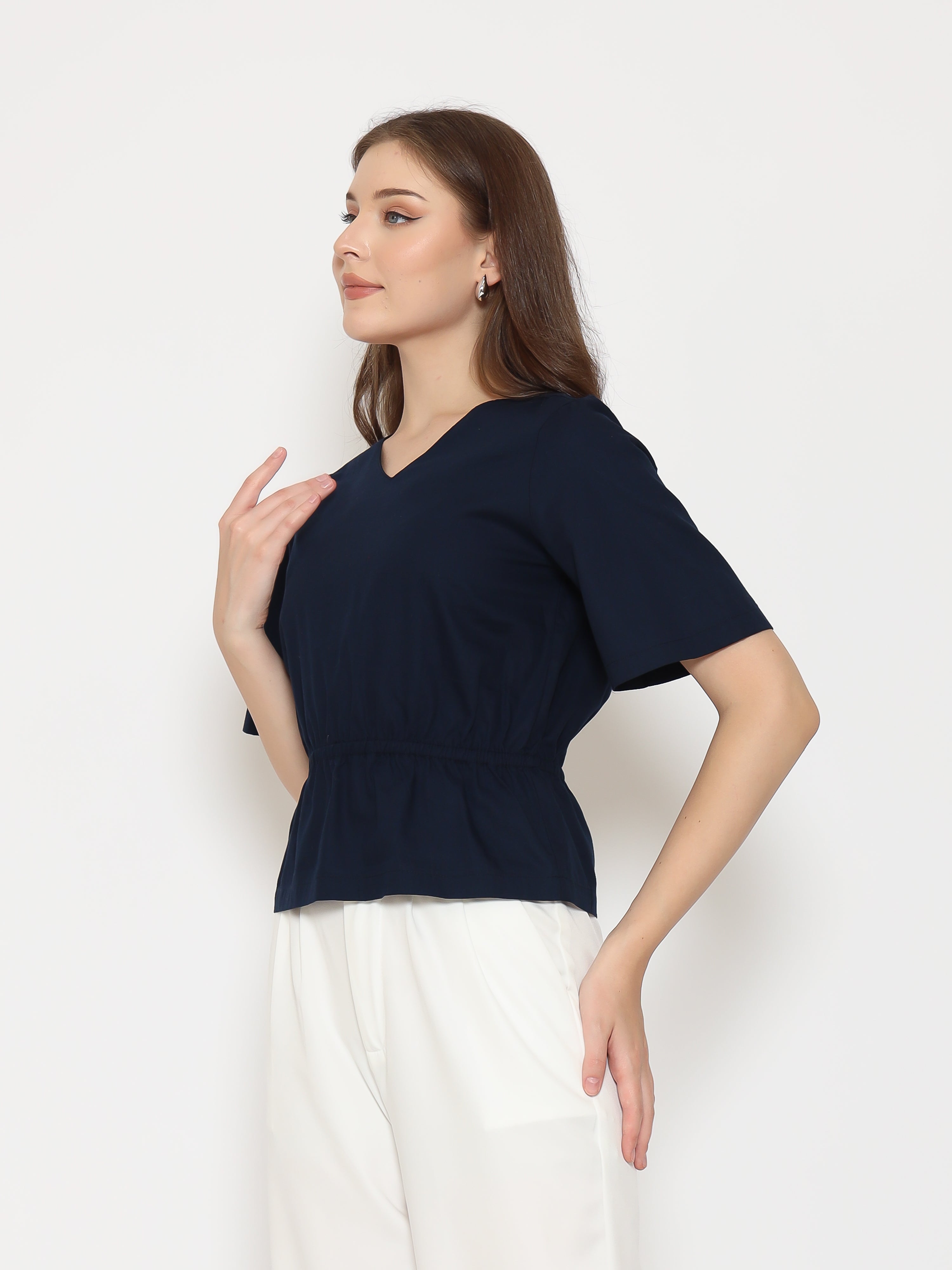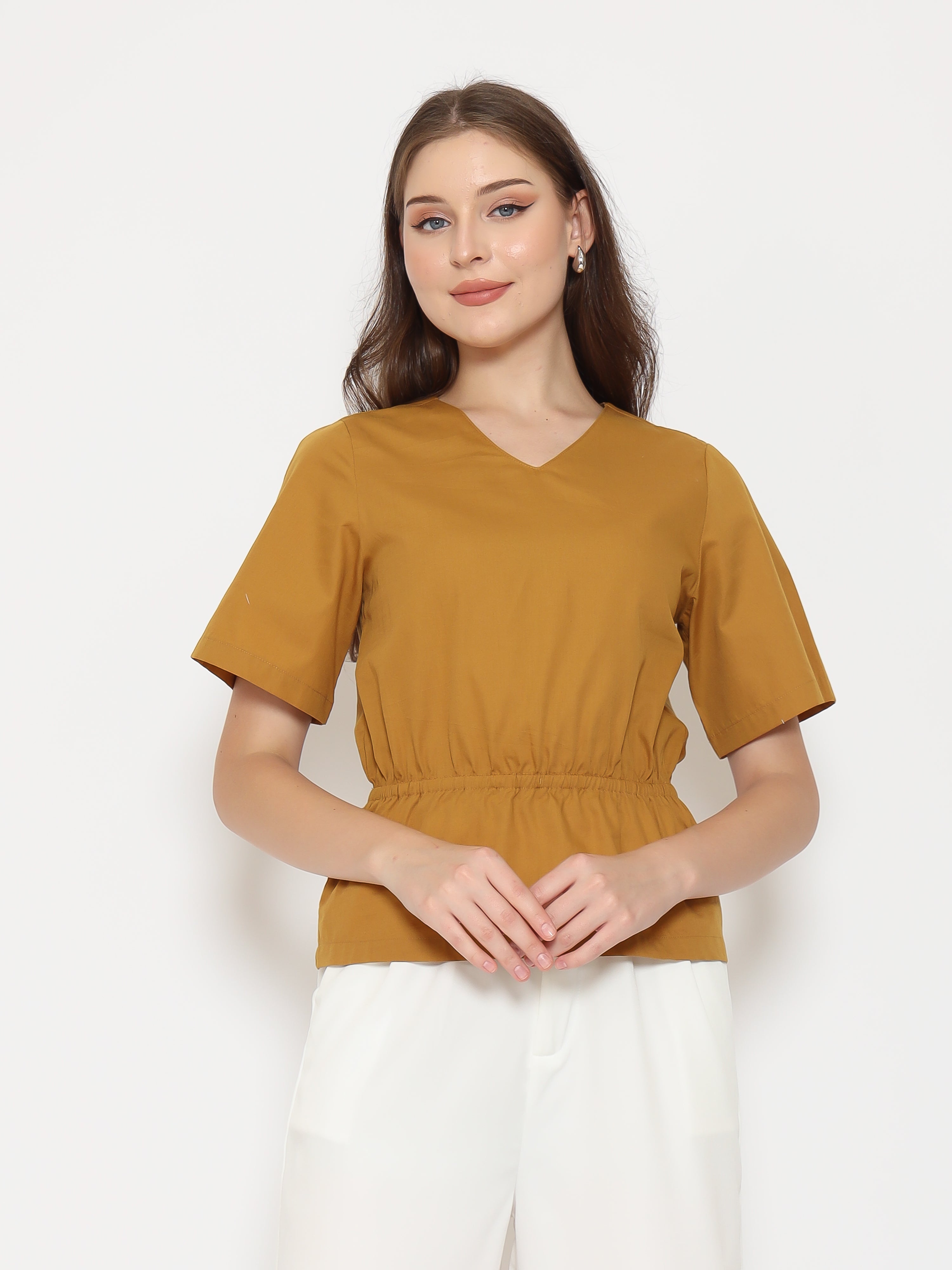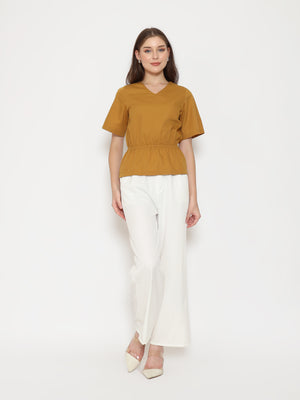 A flattering everyday top with refined details. The Harlow Womens Gathered Top features a V-neckline and gathered waistband that creates a soft, feminine silhouette. Made from crisp cotton poplin for a clean and comfortable fit.
