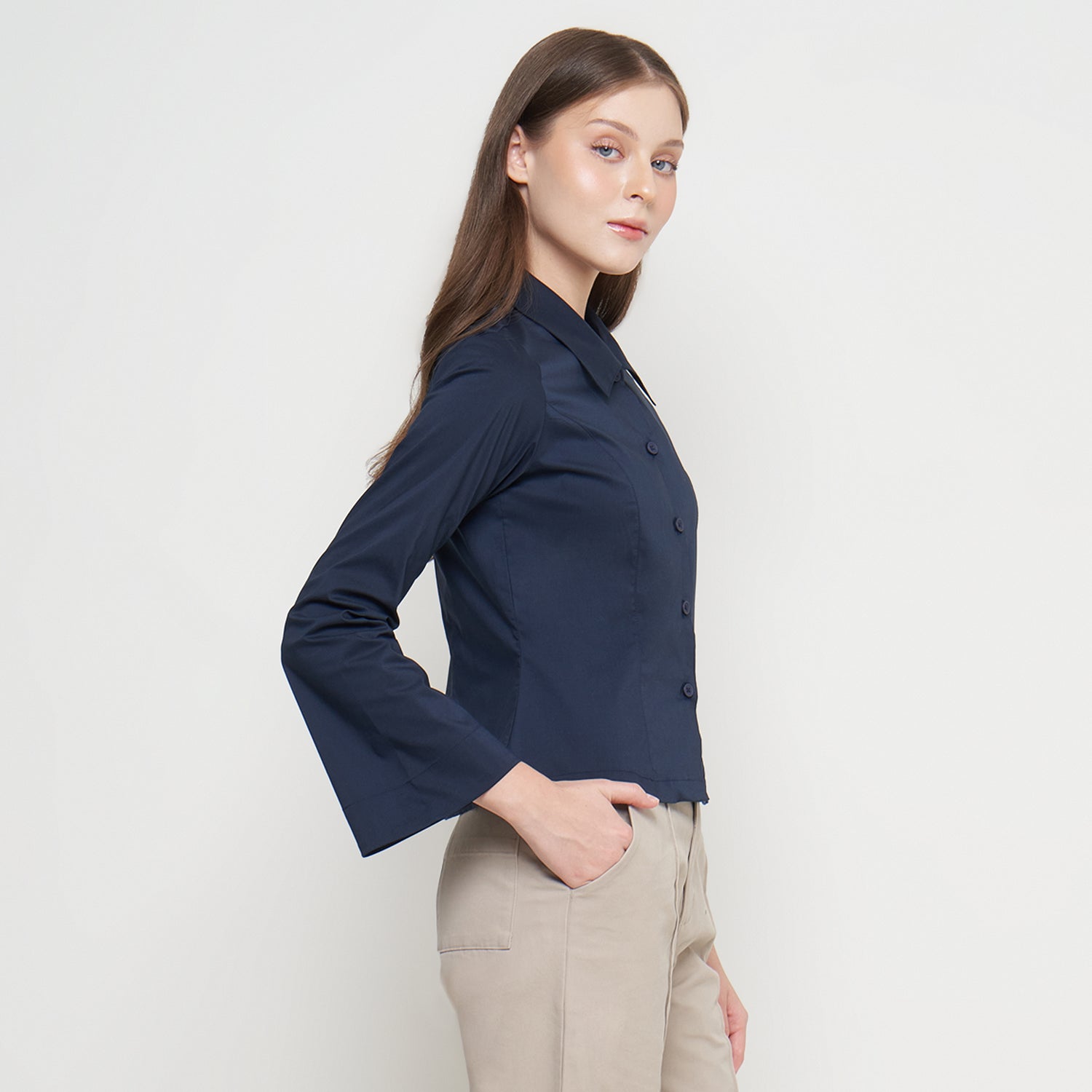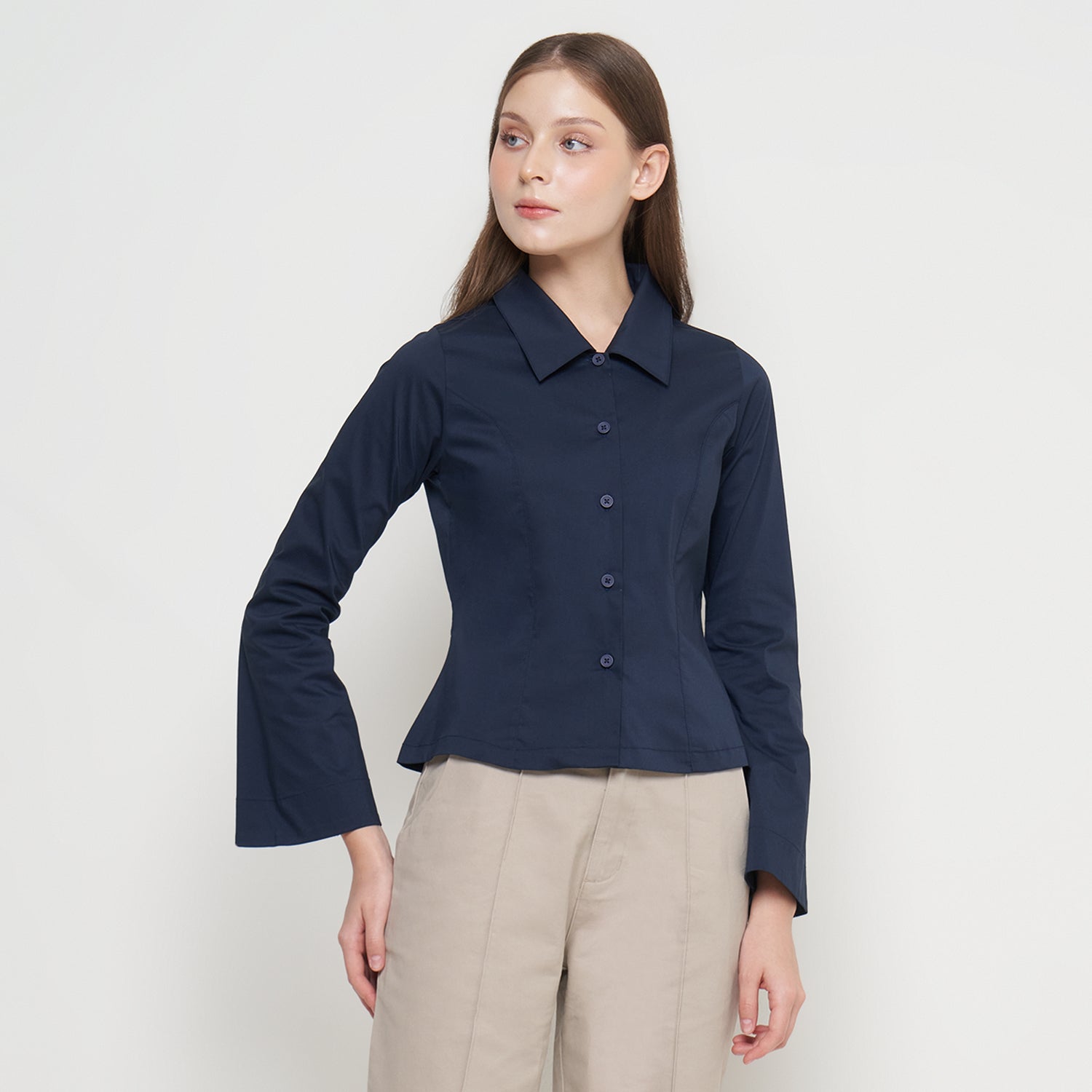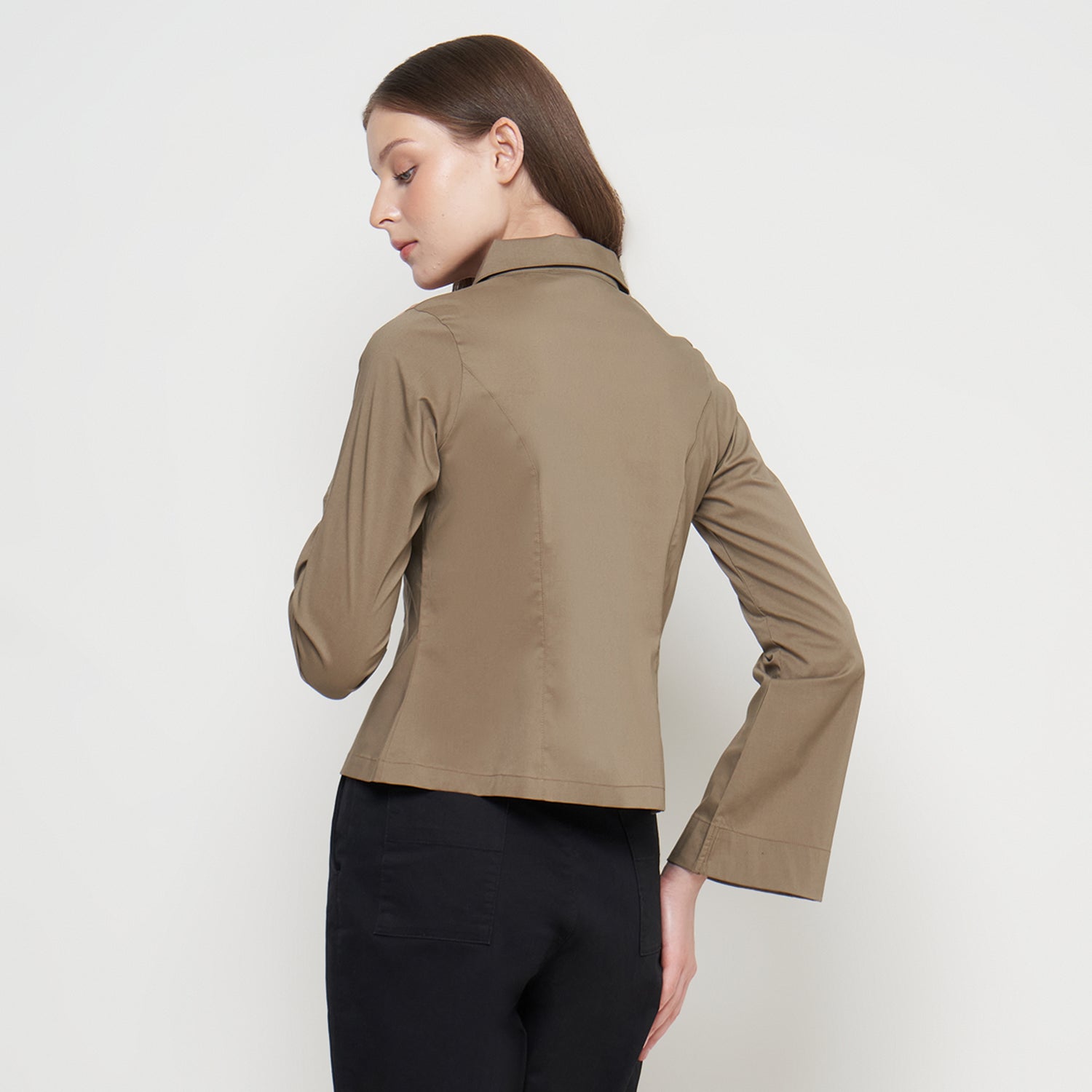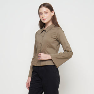 Features: Body-Fit Shirt, Rolled Collar, Flared Sleeves, Button