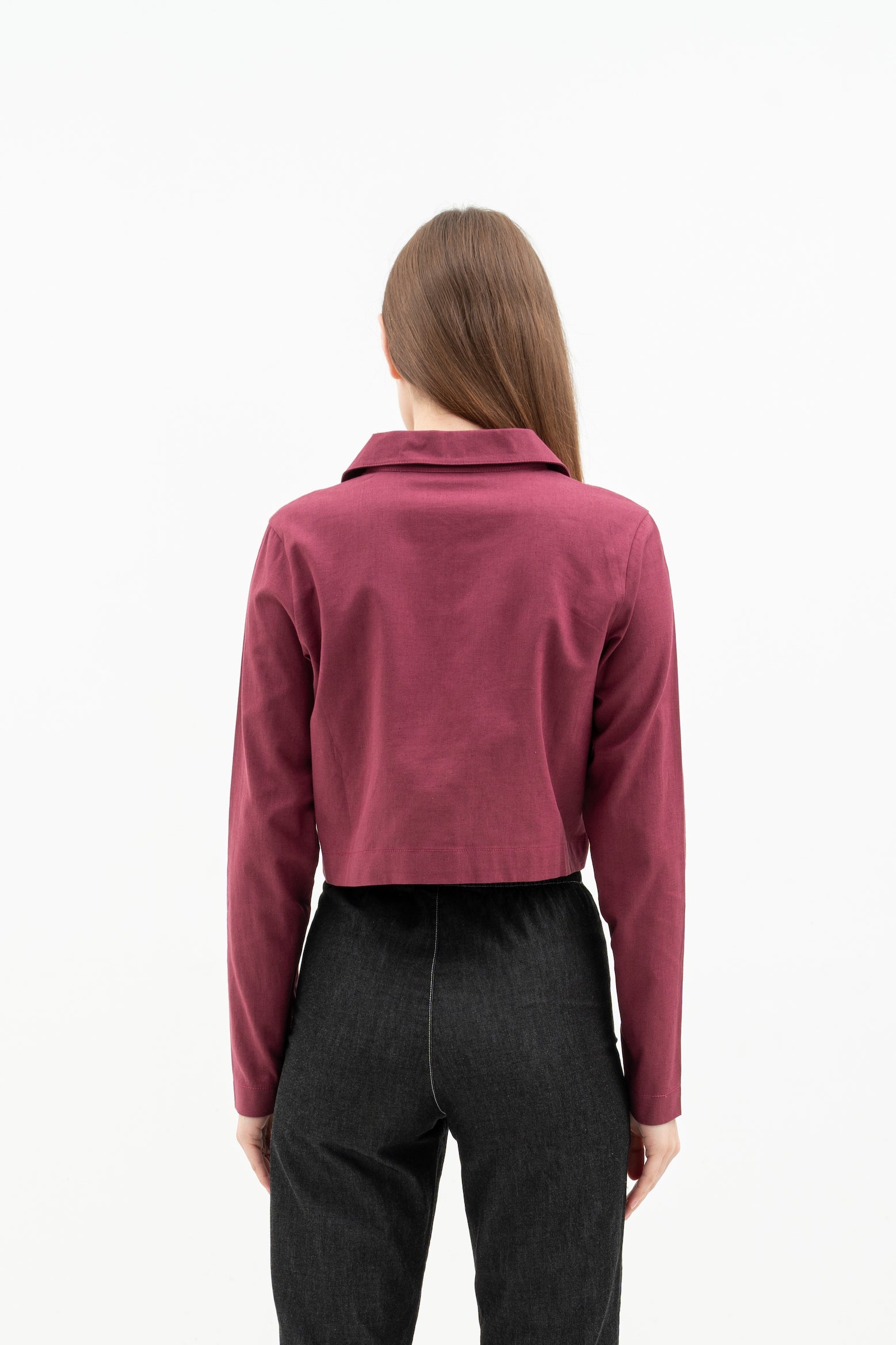The Lula women's cropped outer is a stylish cropped outer which is made from a soft and breathable linen-rayon blend. It features a rolled collar and a patch pocket on the front, adding a casual yet polished touch. Perfect for layering on cool days.