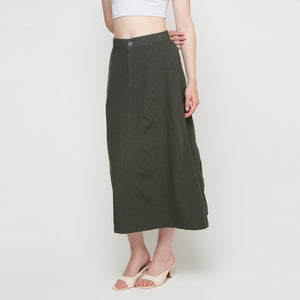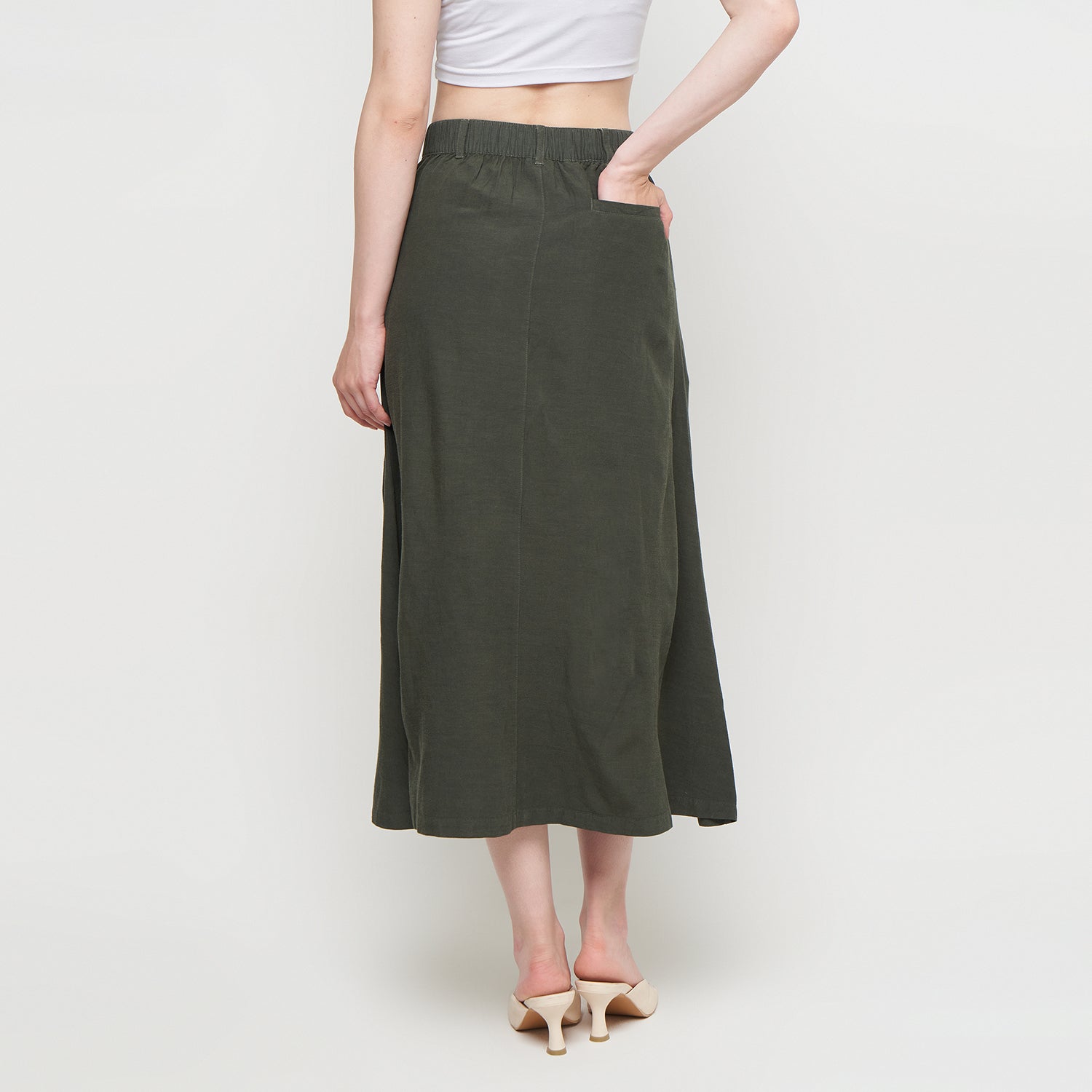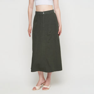 Features: A-line Skirt, Midi, Waistband, Belt Loop, Button and Zipper, Side Pockets, Welt Pocket