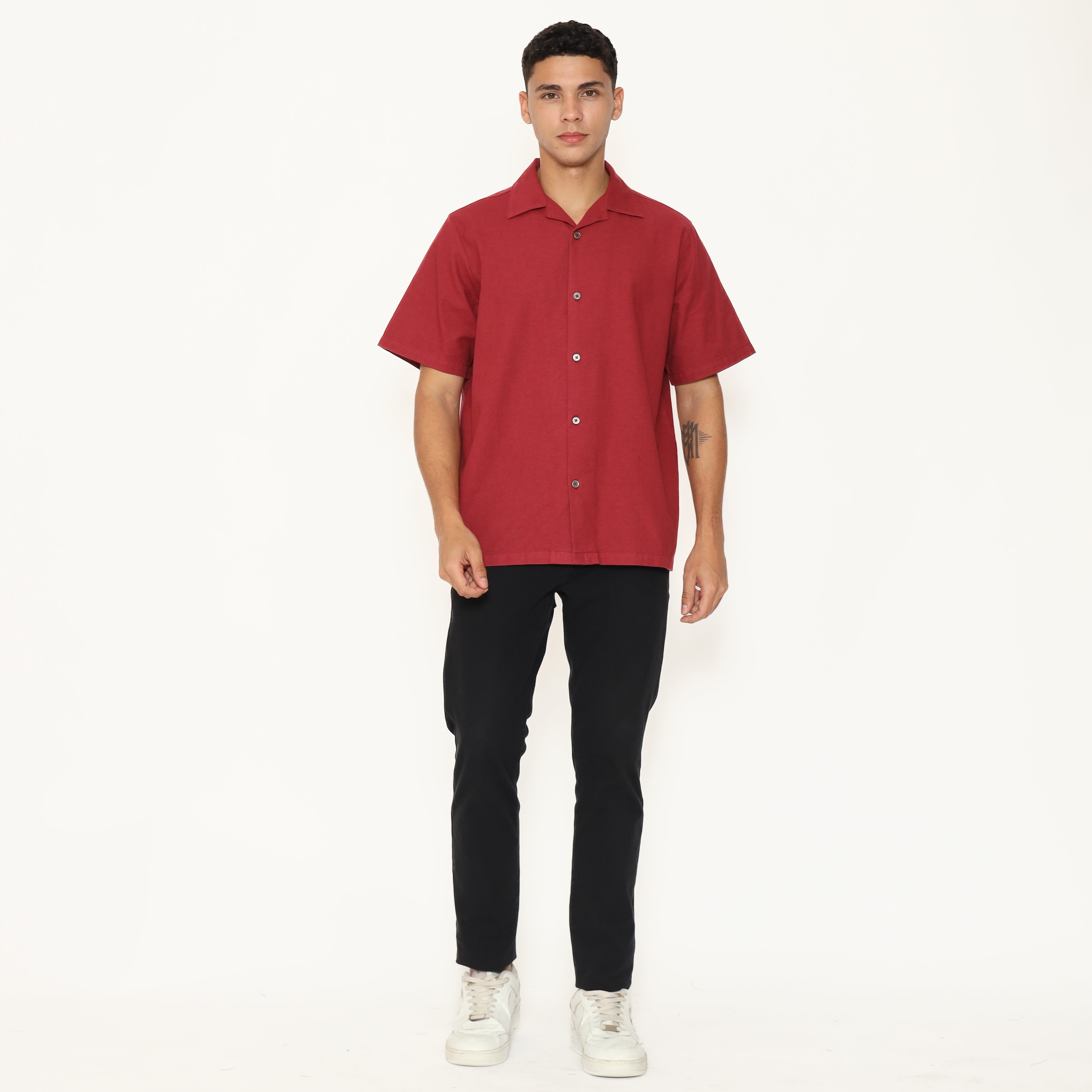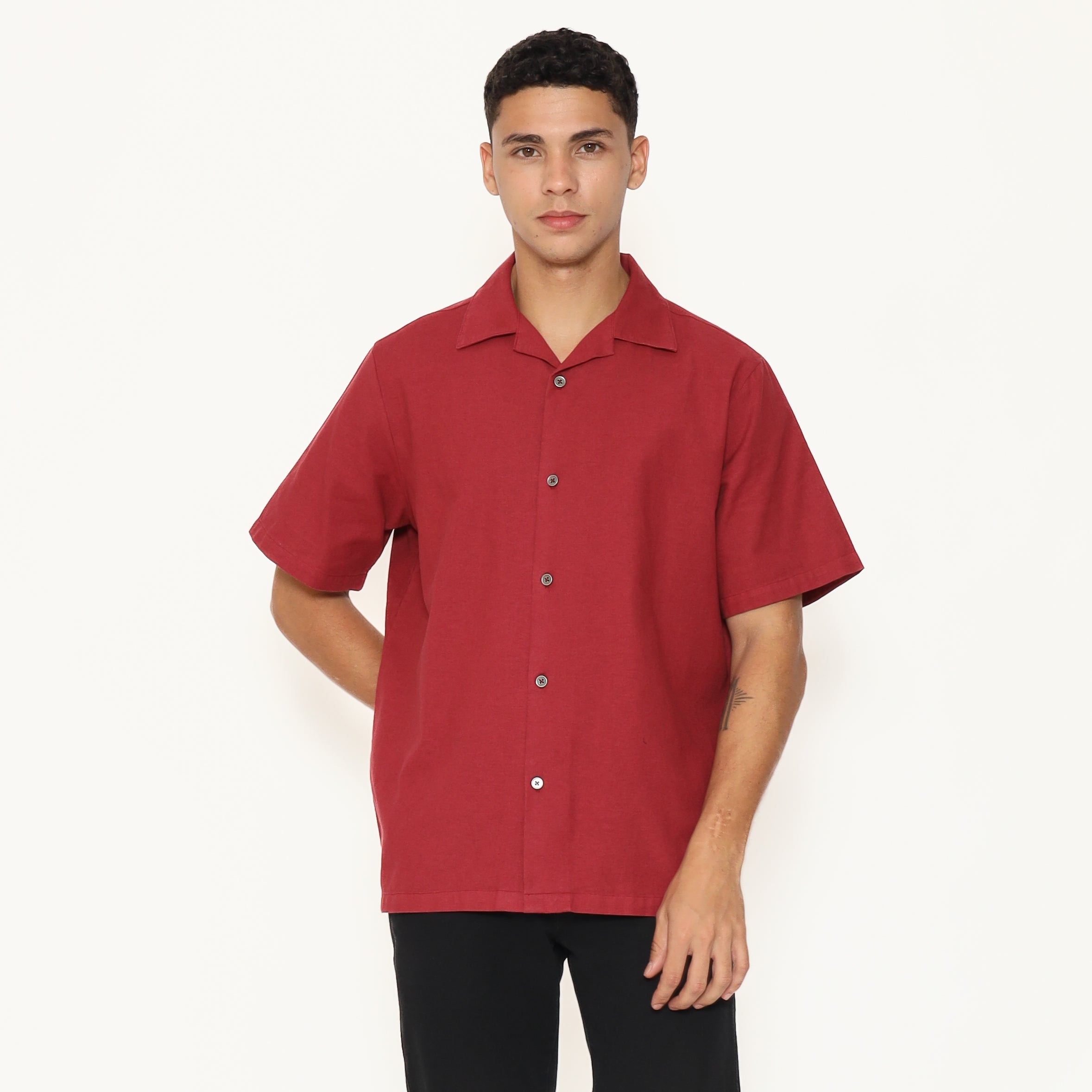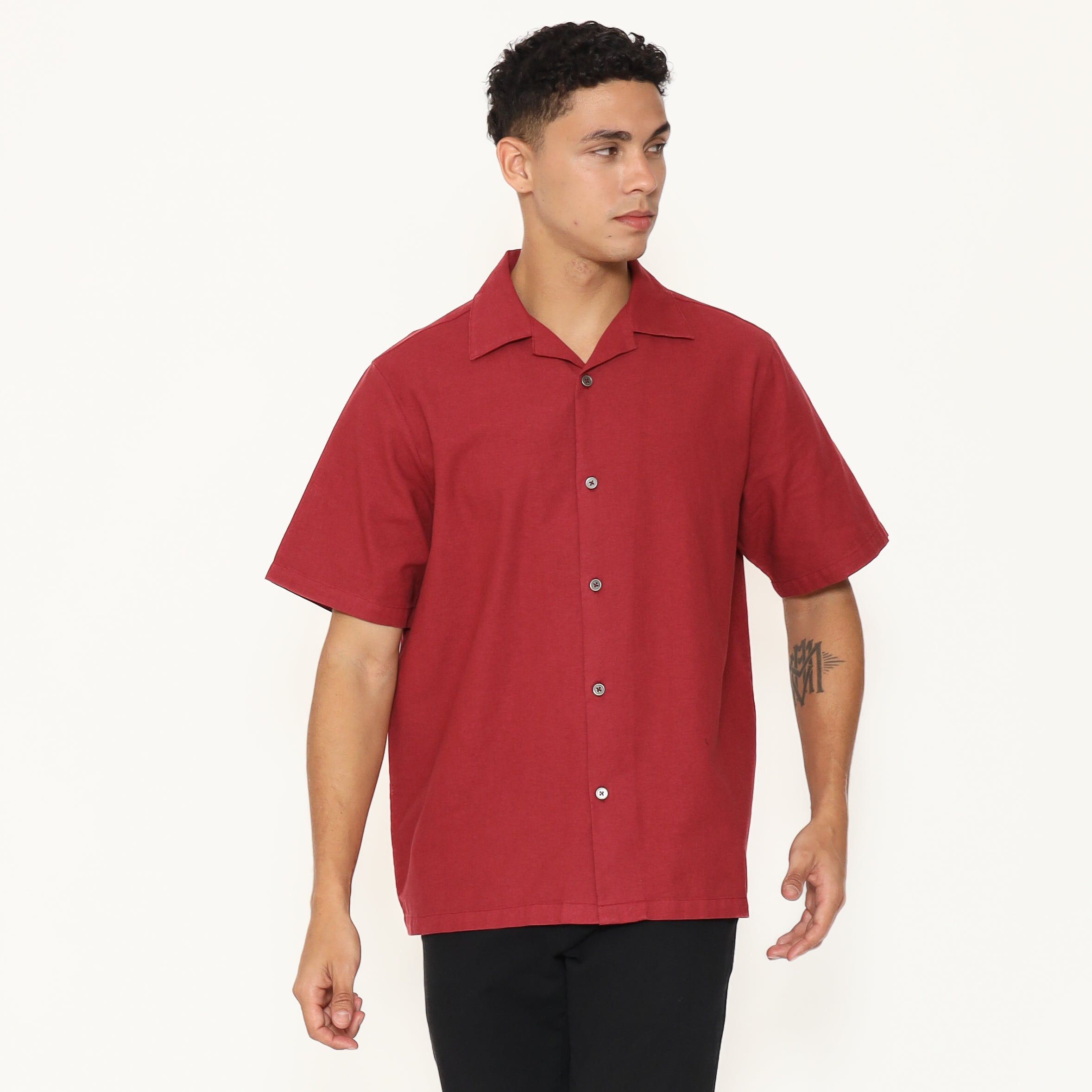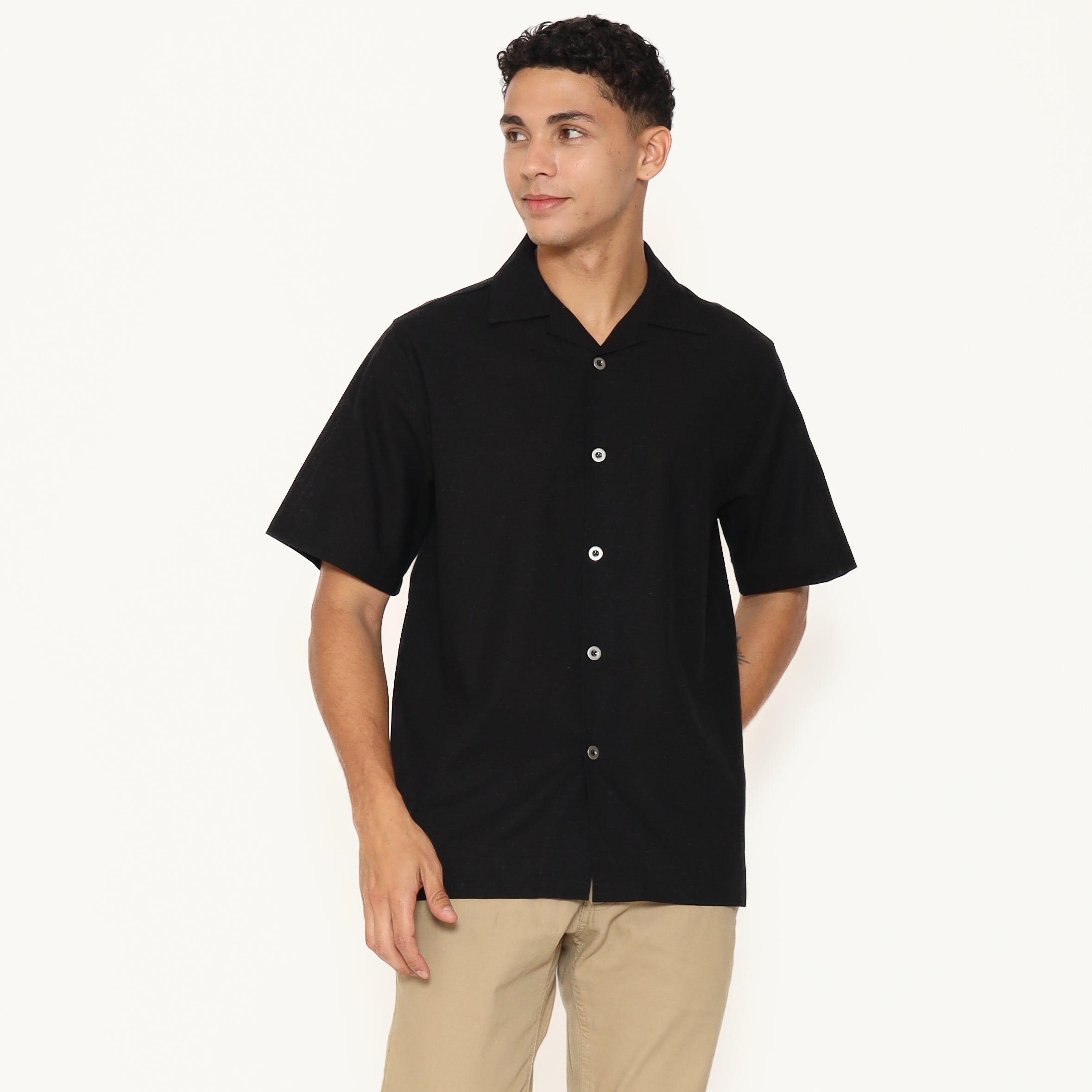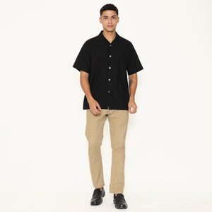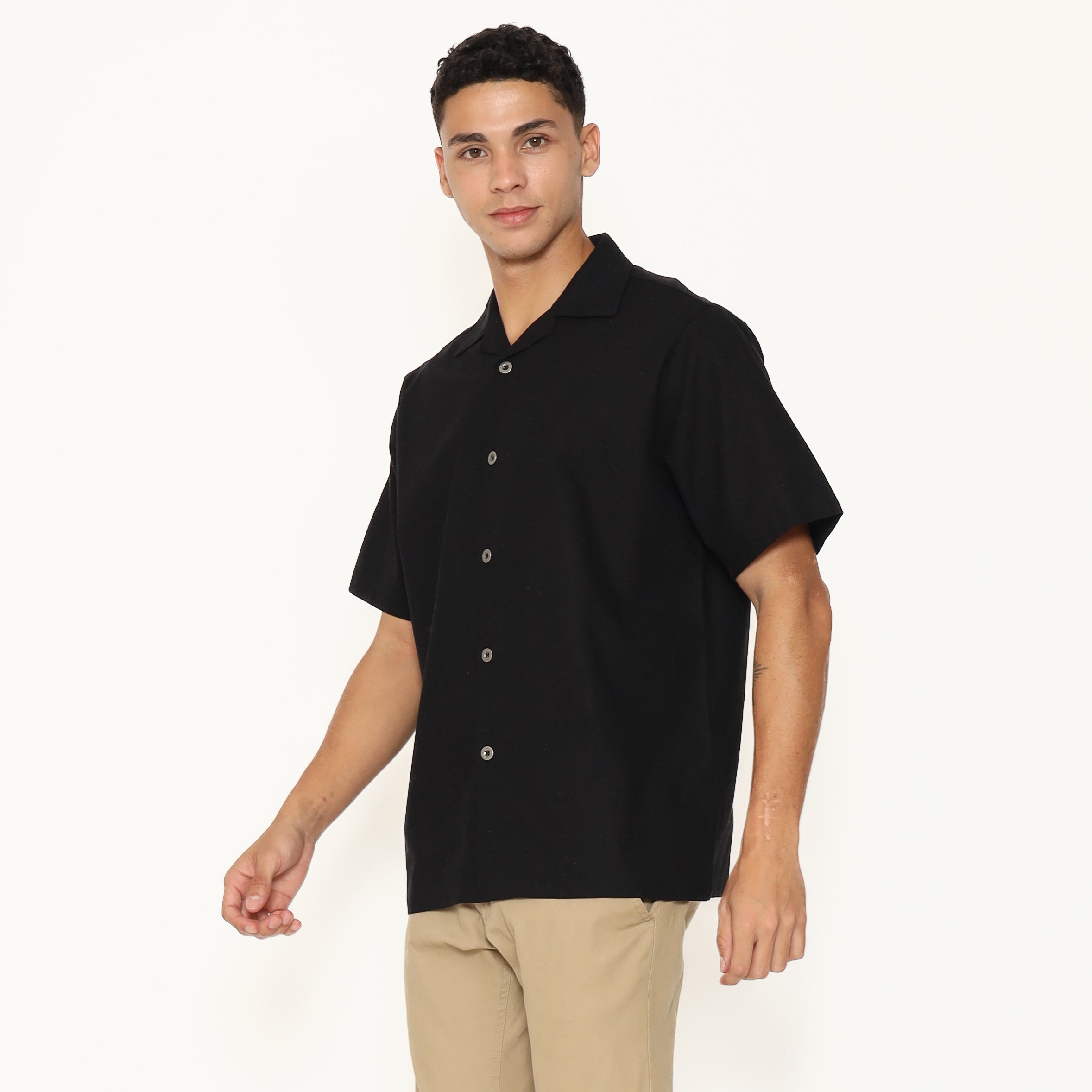 Noel Men's Top is a comfortable regular-fit shirt made from breathable cotton rami fabric, perfect for staying cool. It features a classic lapel and collar, short sleeves, and buttons down the center front for easy wear. The natural texture of the fabric adds a subtle touch of style to this everyday essential.