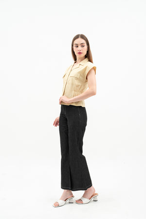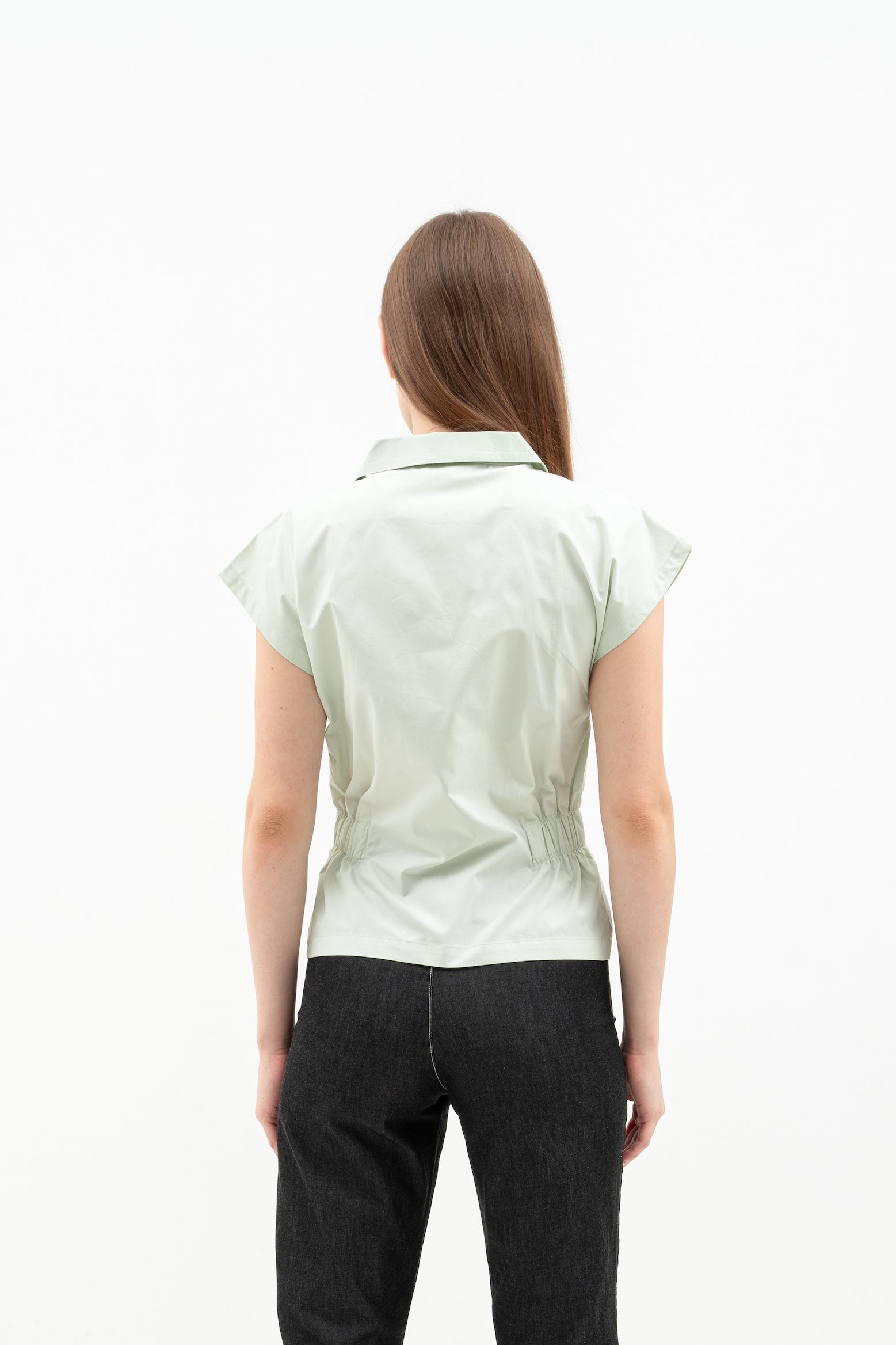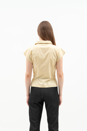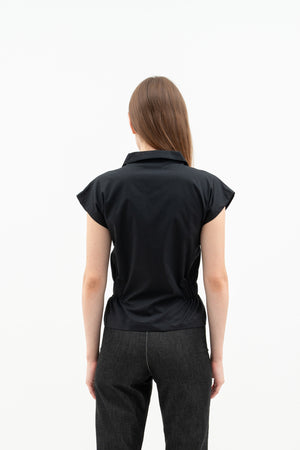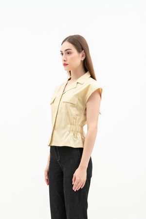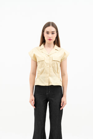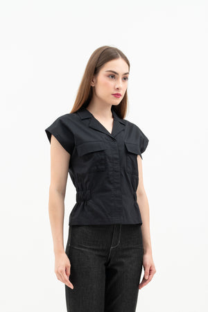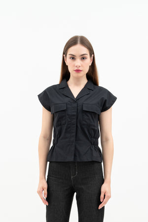 The Nora Women's Top is made from soft cotton poplin with relaxed batwing sleeves and a folded collar. It has elastic at the sides for a comfortable fit, a hidden front button for easy wear, and front patch pockets for style.