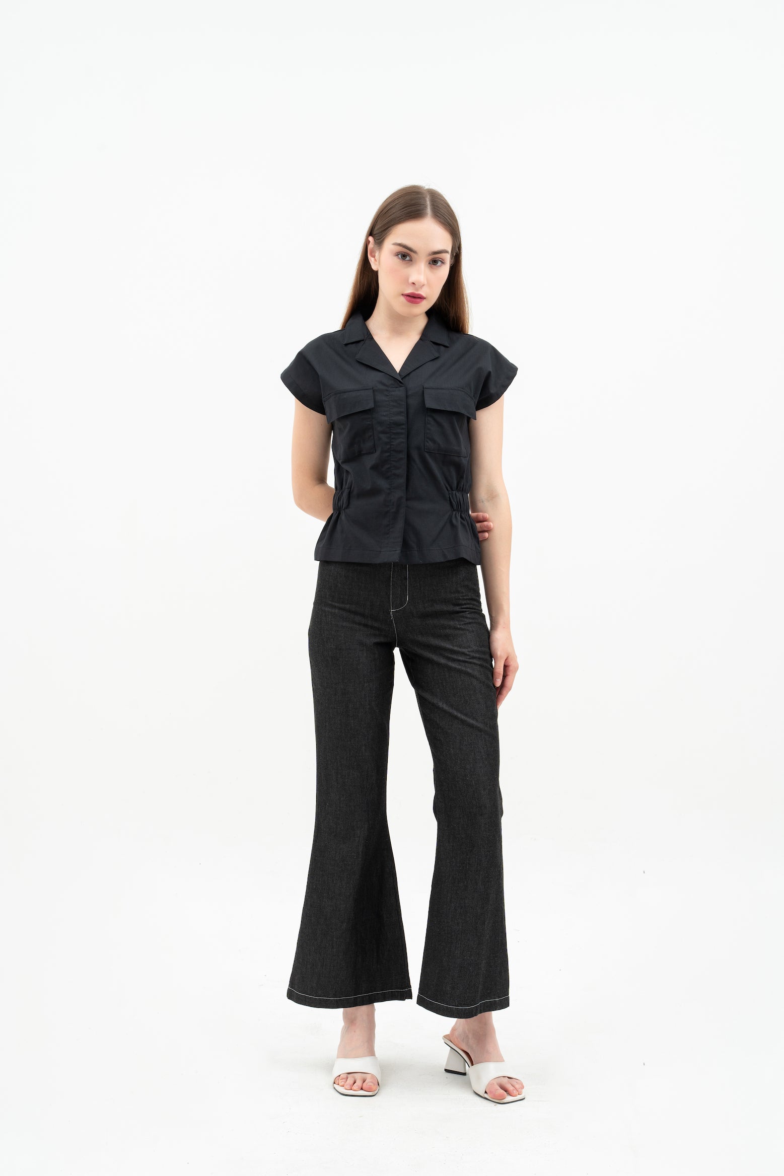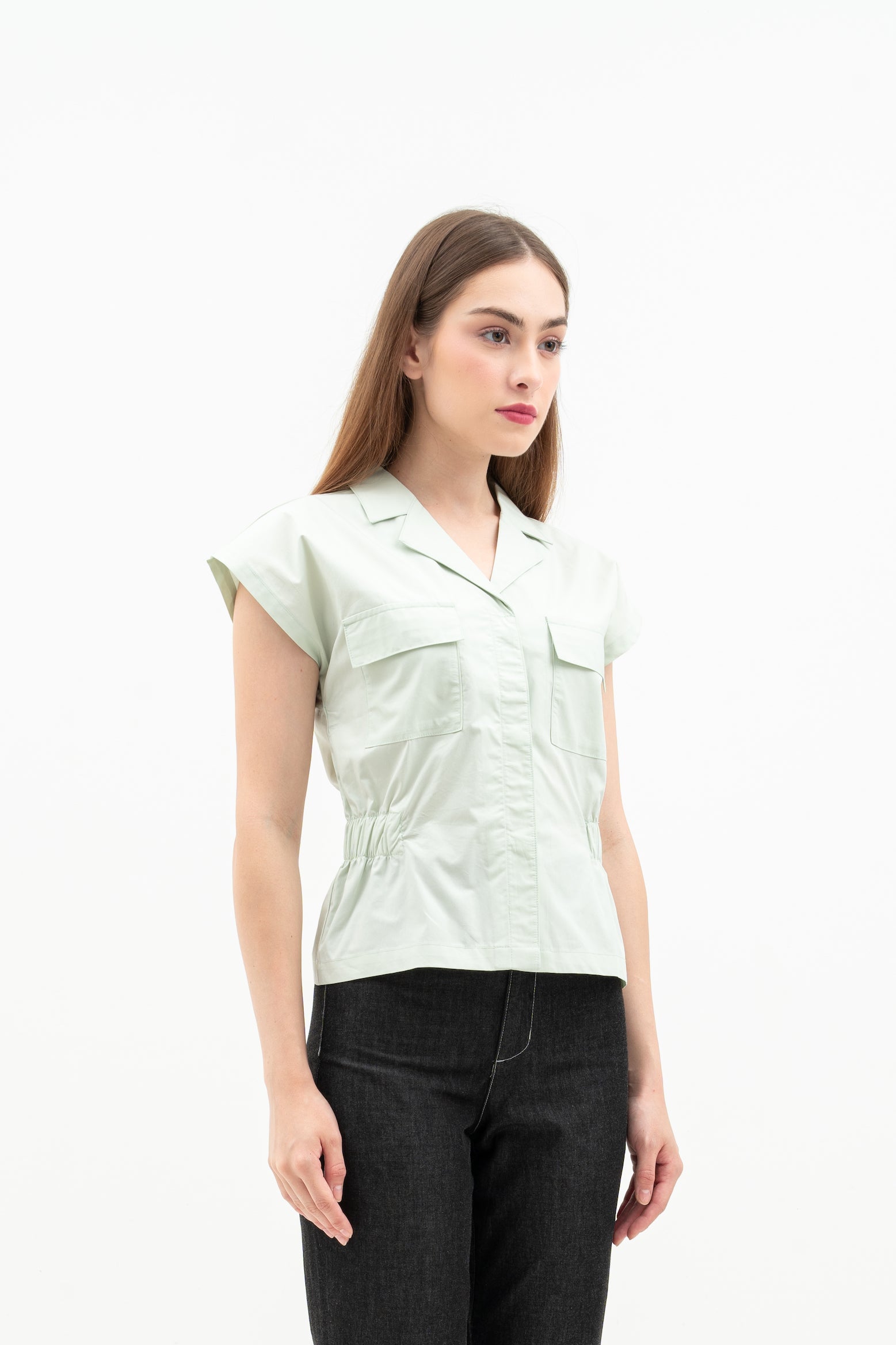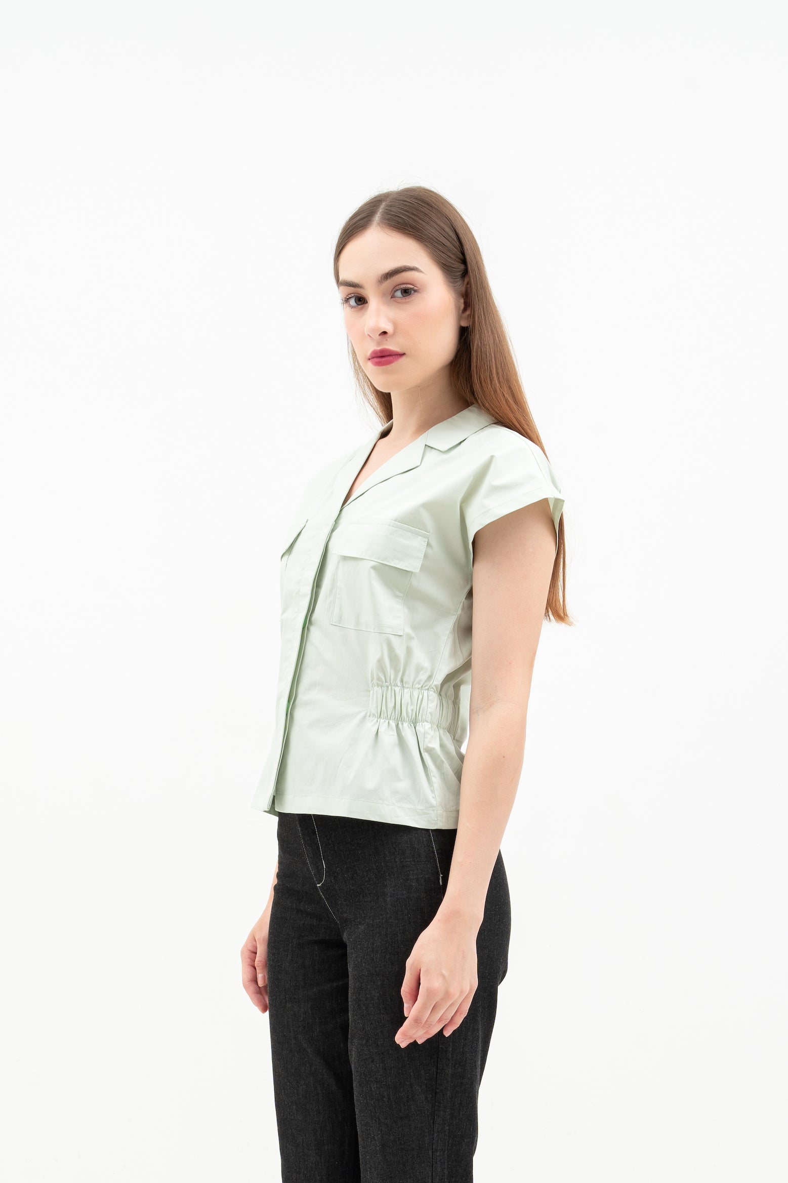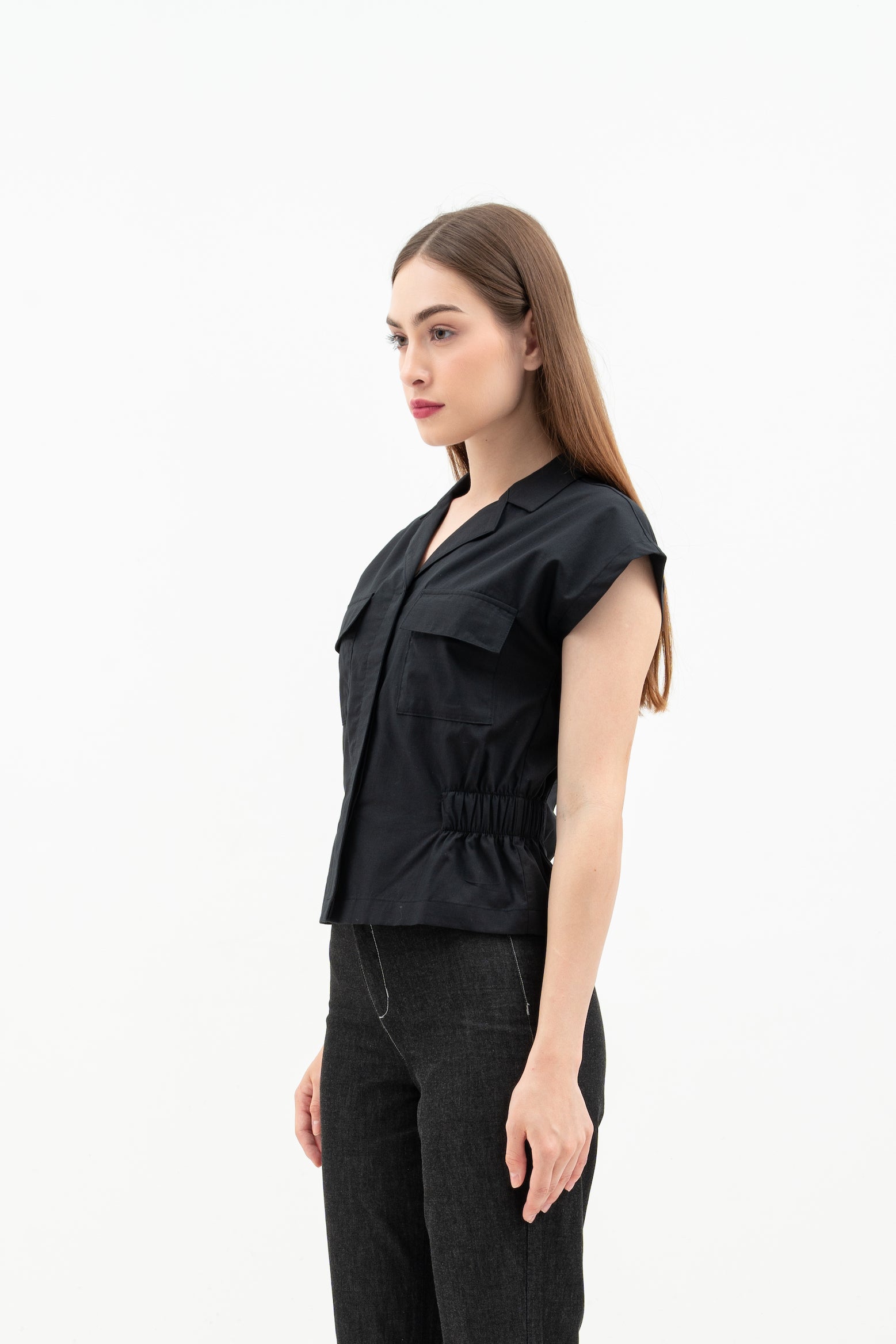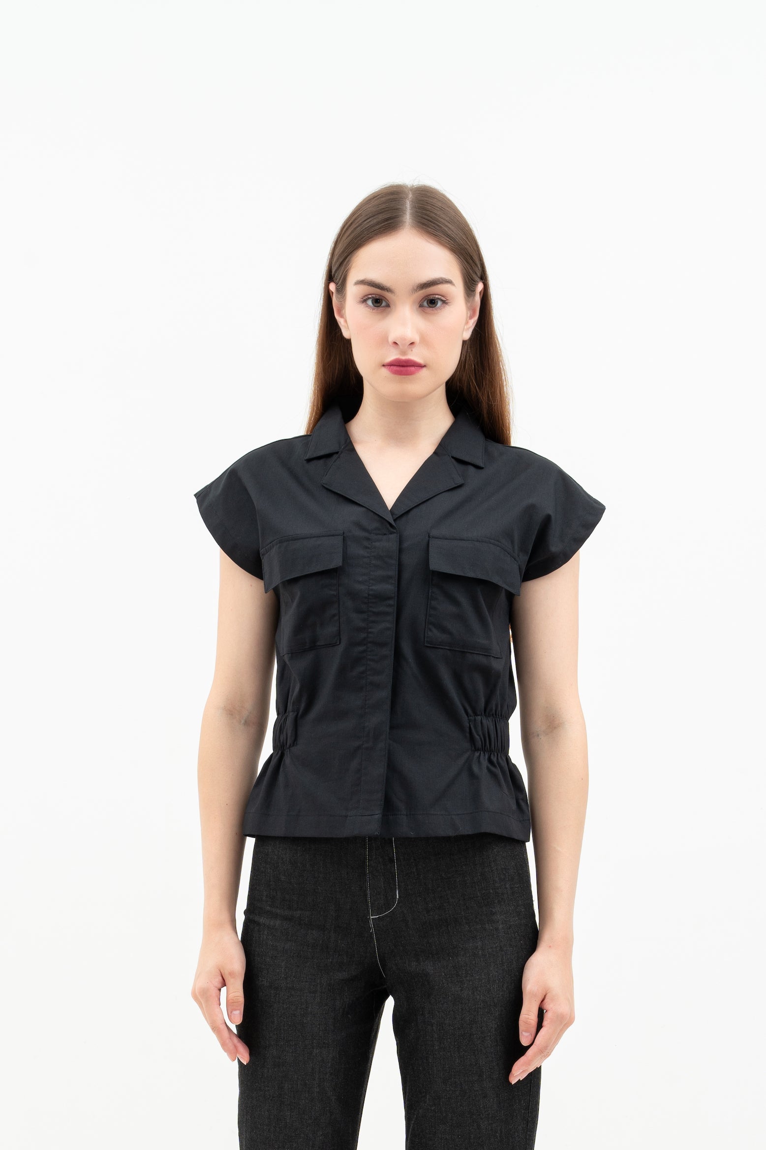 Features: Regular Fit Top, Batwing Sleeves, Hidden Button, Rolled Collar, Patch Pockets