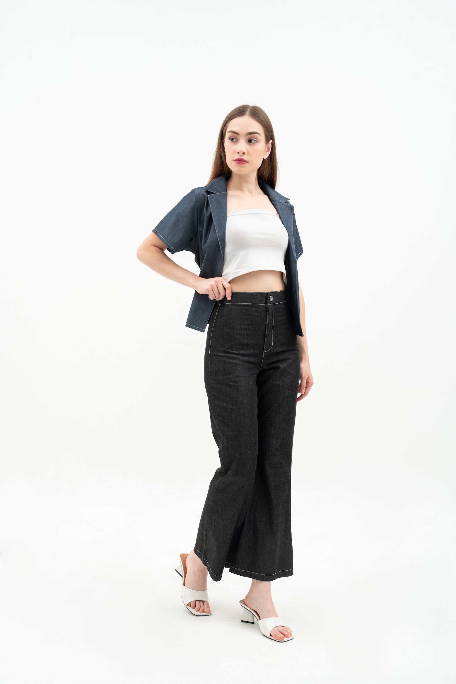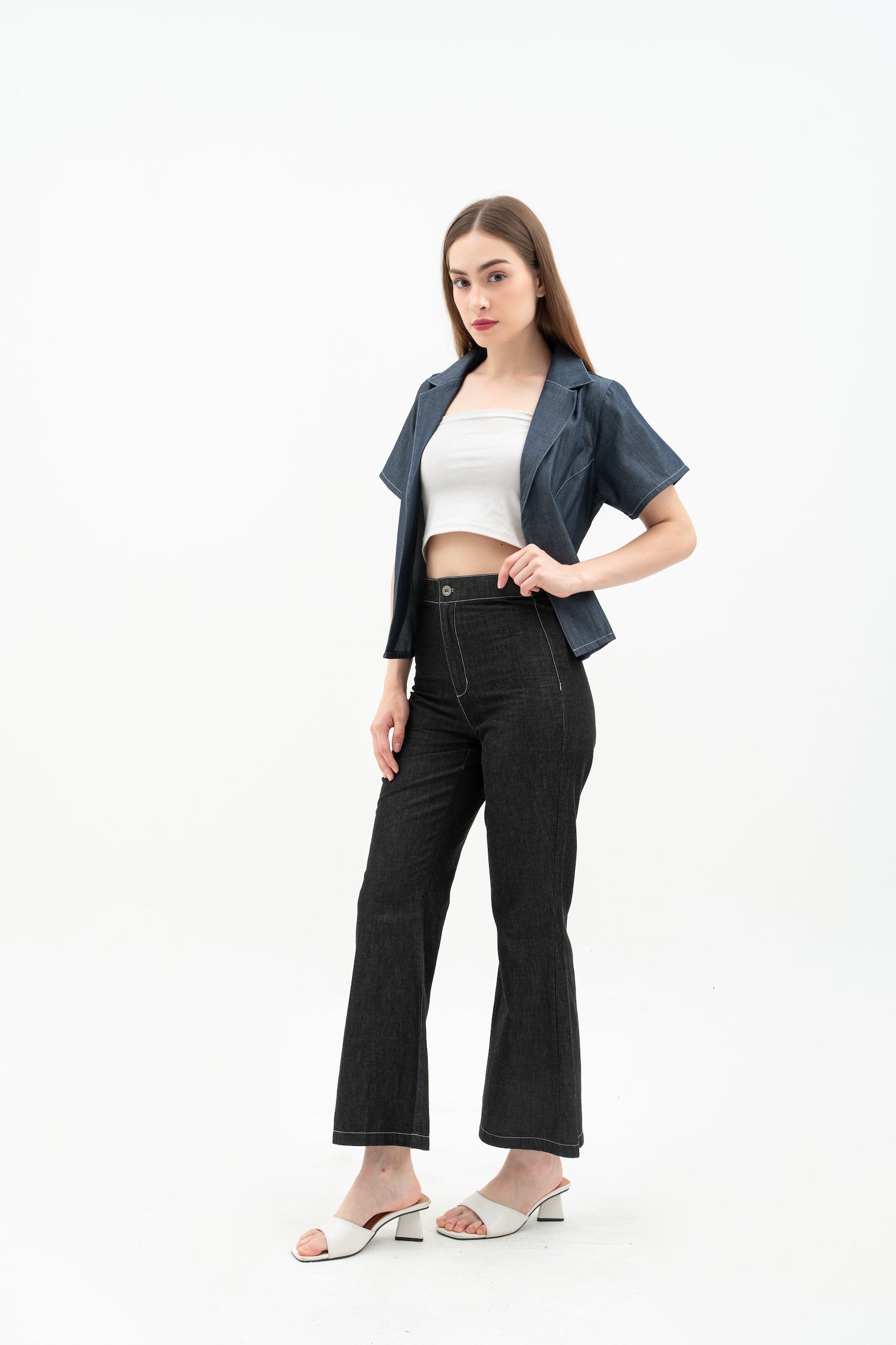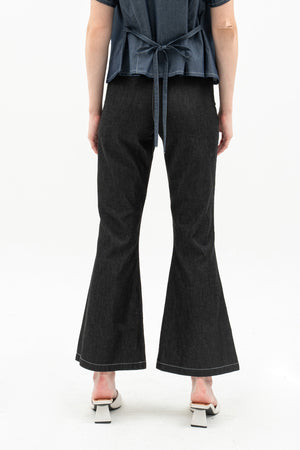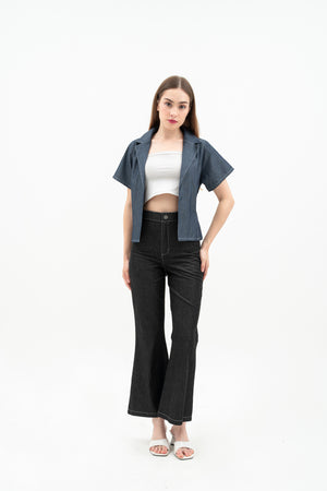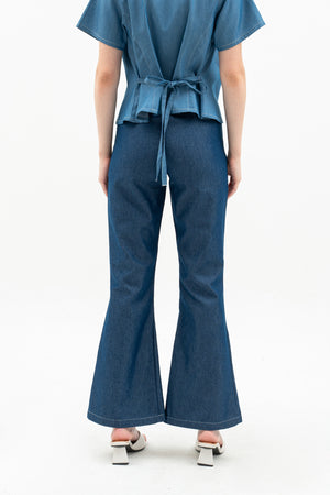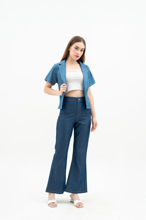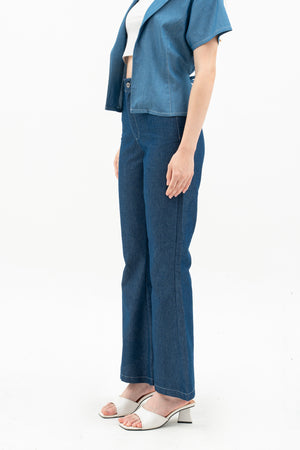 Vara Women's Pants are basic denim pants with a flattering flare hem and a comfortable waistband. They feature a button and zipper at the center front for easy wear. A stylish and simple choice for everyday looks.
